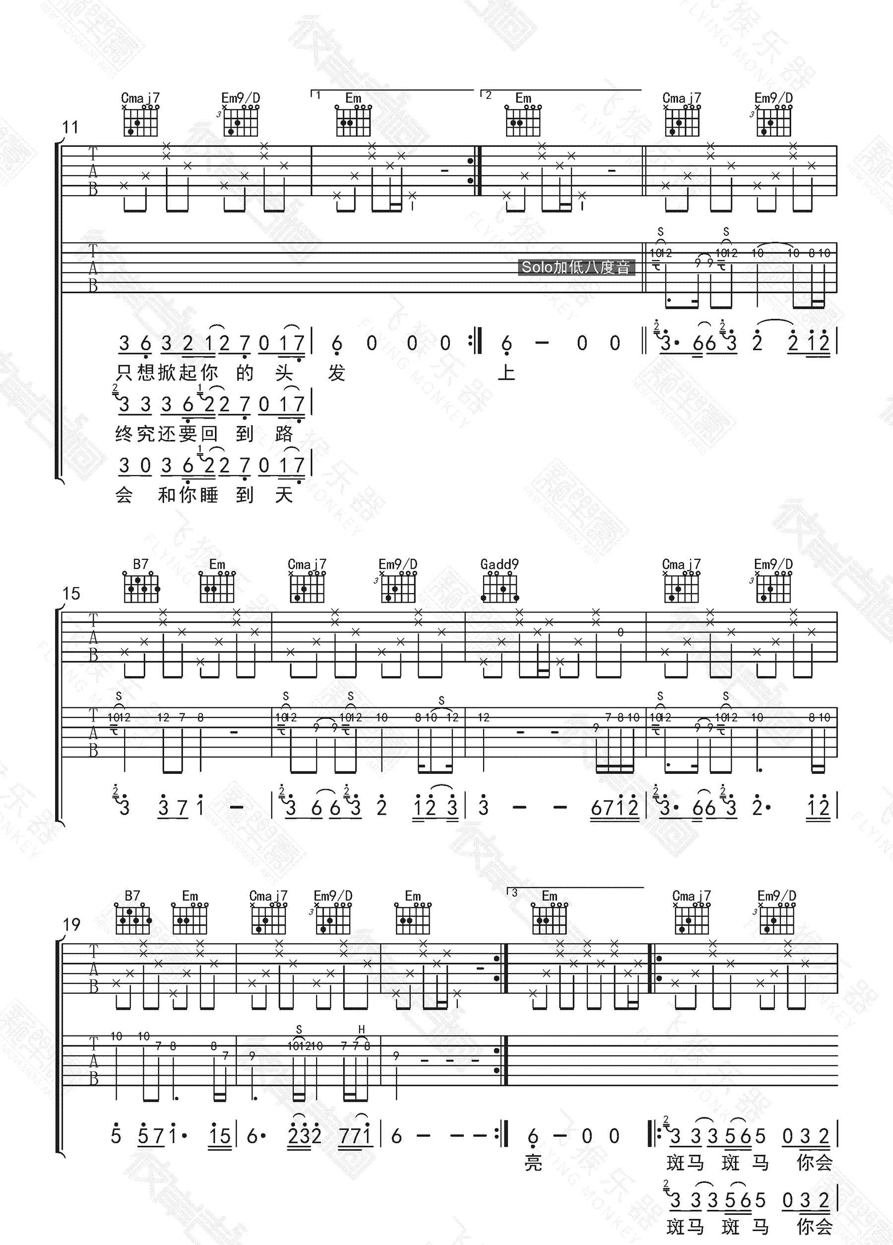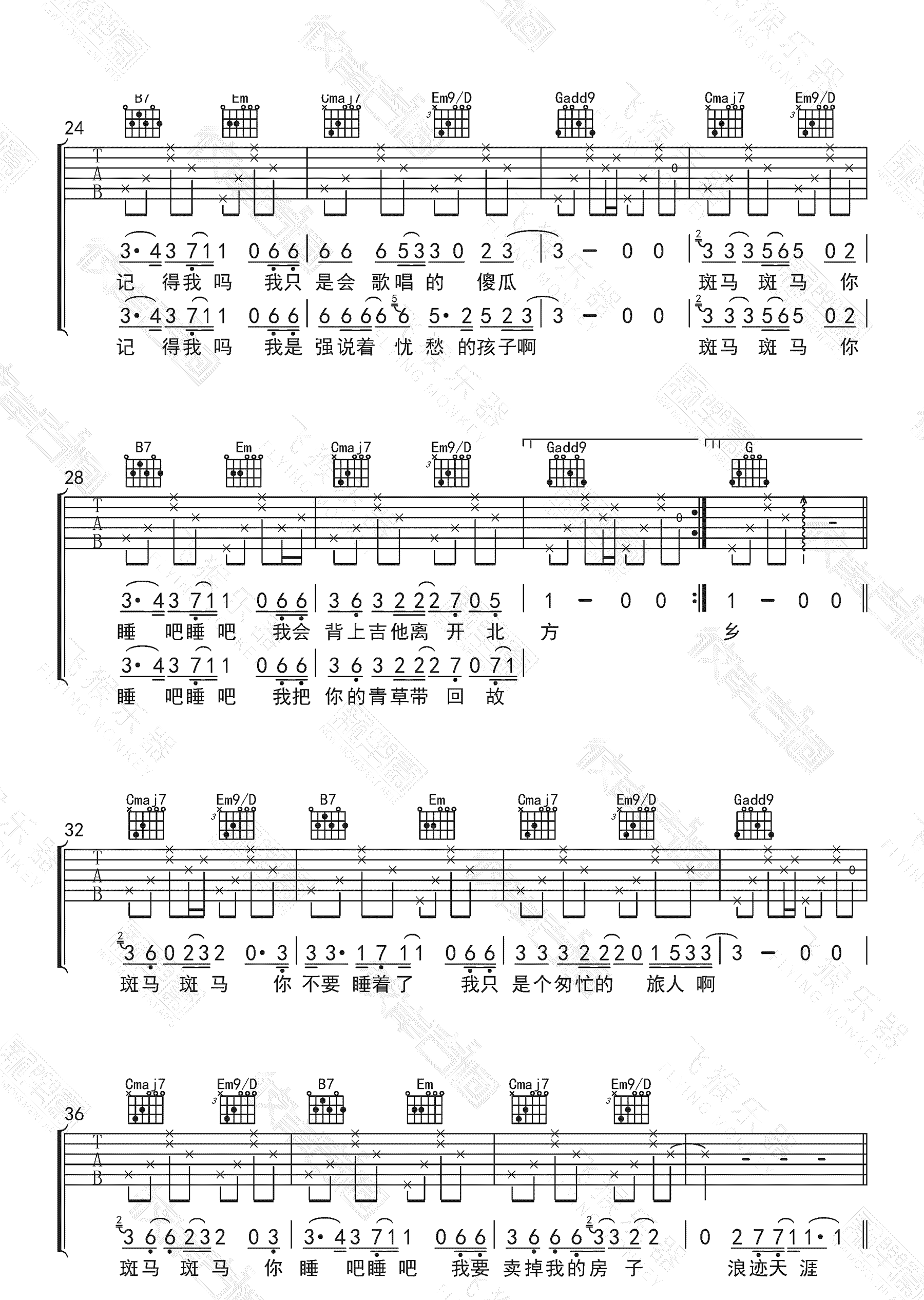 当前位置:琴谱网>吉他弹唱>斑马斑马 宋冬野 G调六线