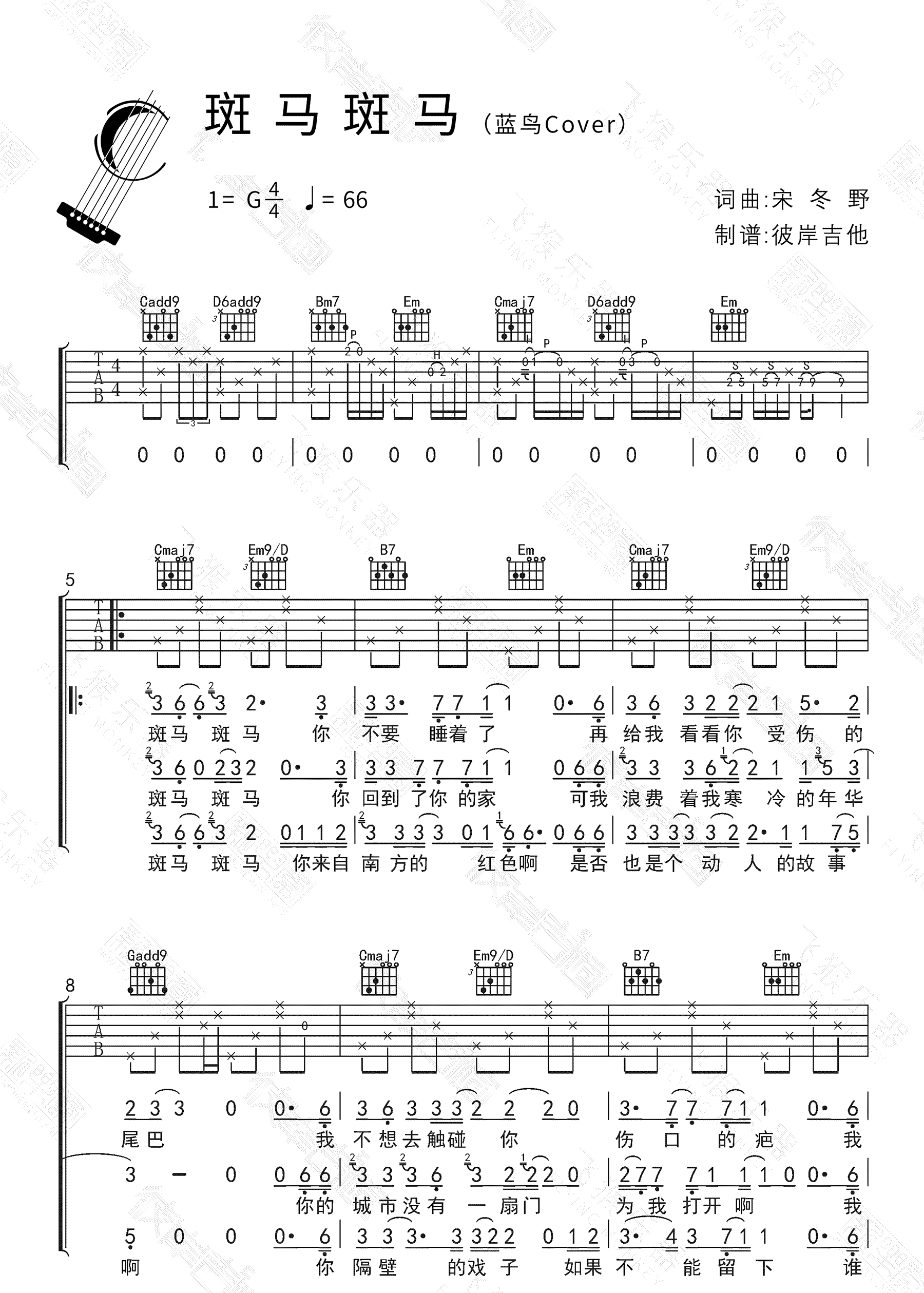 斑马斑马 宋冬野 G调六线吉他谱 - 斑马斑马 - G调吉他弹唱谱