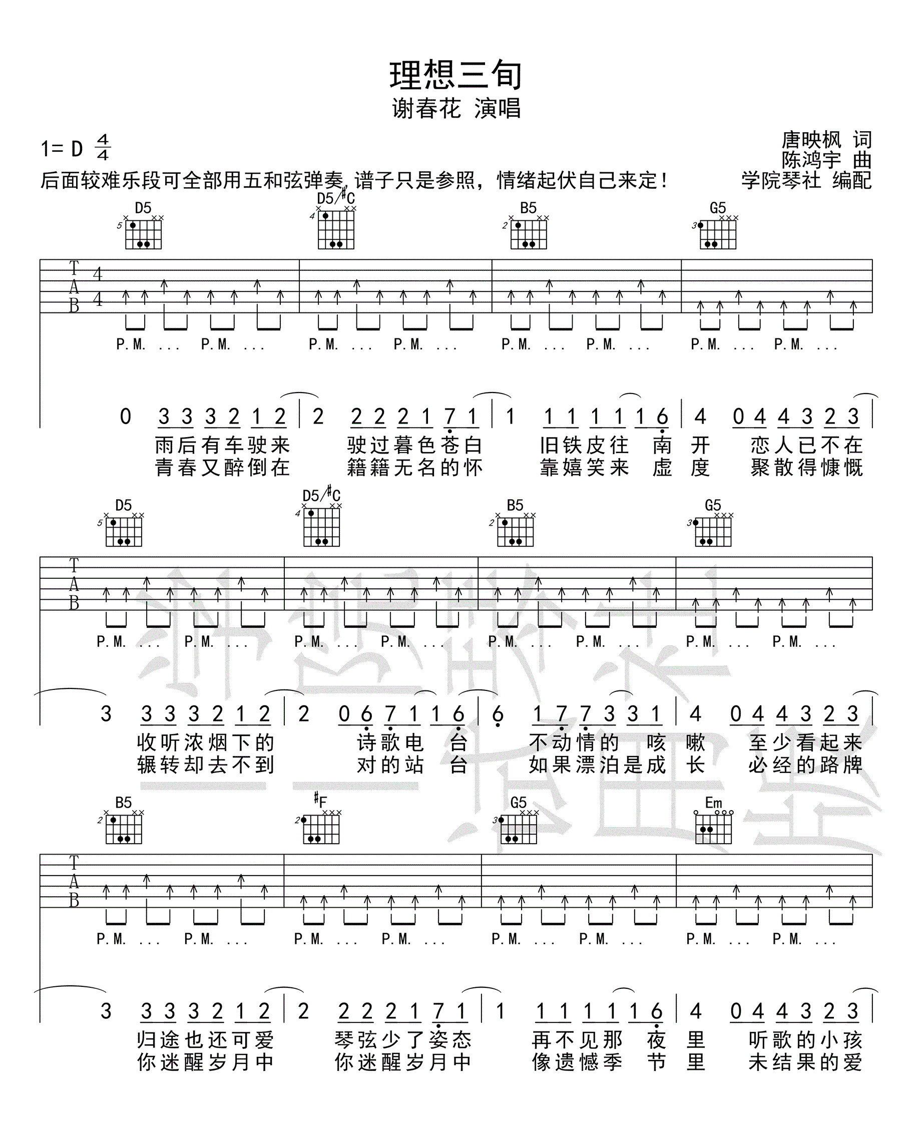 理想三旬 谢春花 D调吉他谱 - 理想三旬 - D调吉他弹唱谱