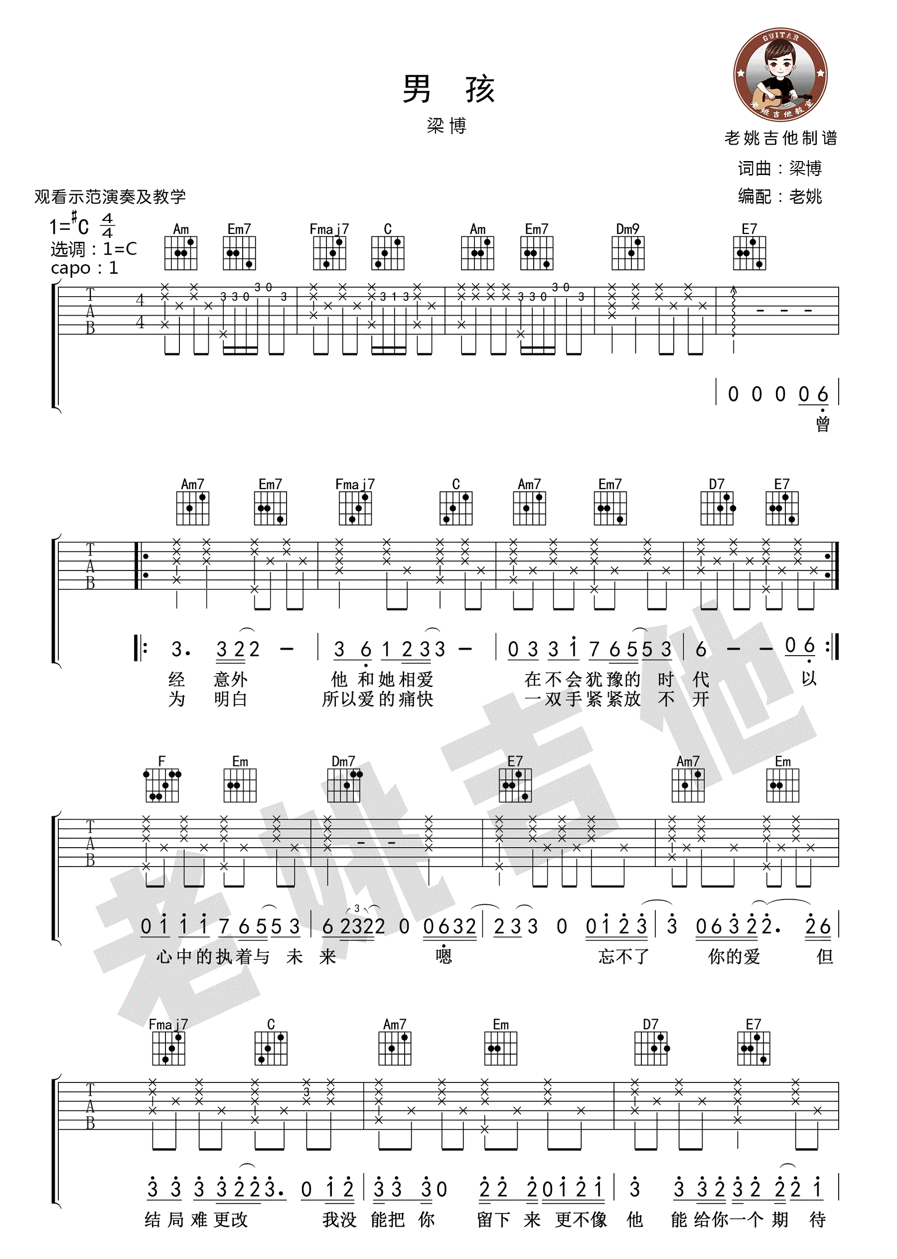 男孩 梁博 C调吉他谱 - 男孩 - C调吉他弹唱谱