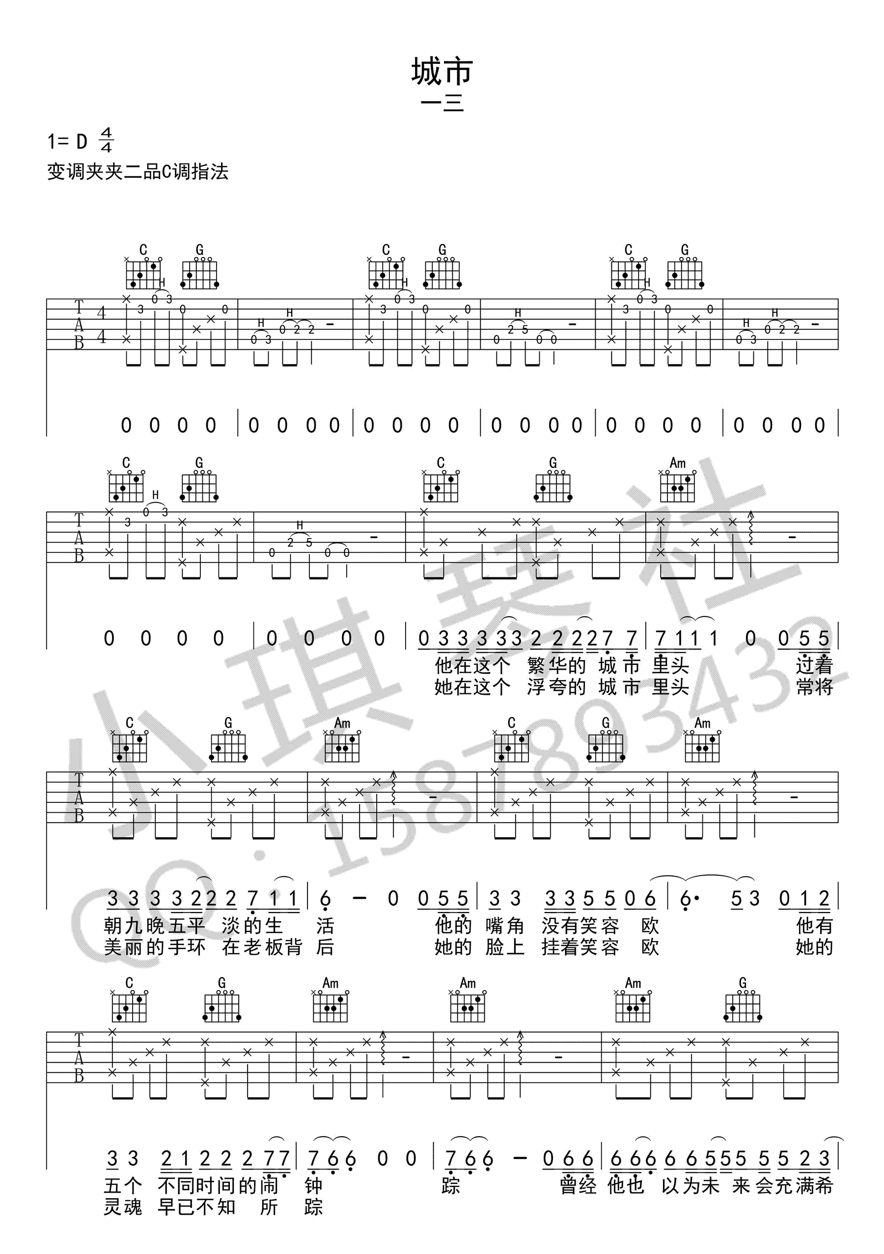 曲谱介绍: 一三《城市》吉他谱,C调指法,变调夹夹二品,音乐人王联词曲创作一首民谣歌曲,城市六线谱,高清弹唱图片谱,感谢小琪琴社编配出品。 独立音乐人组合一三和他们的代表作品《城市》,唱出生活的不易和理想的不堪一击,在这个孤独的城市里,依旧在努力在前行,仍在不停的向梦想迈出一步步艰难的脚印。