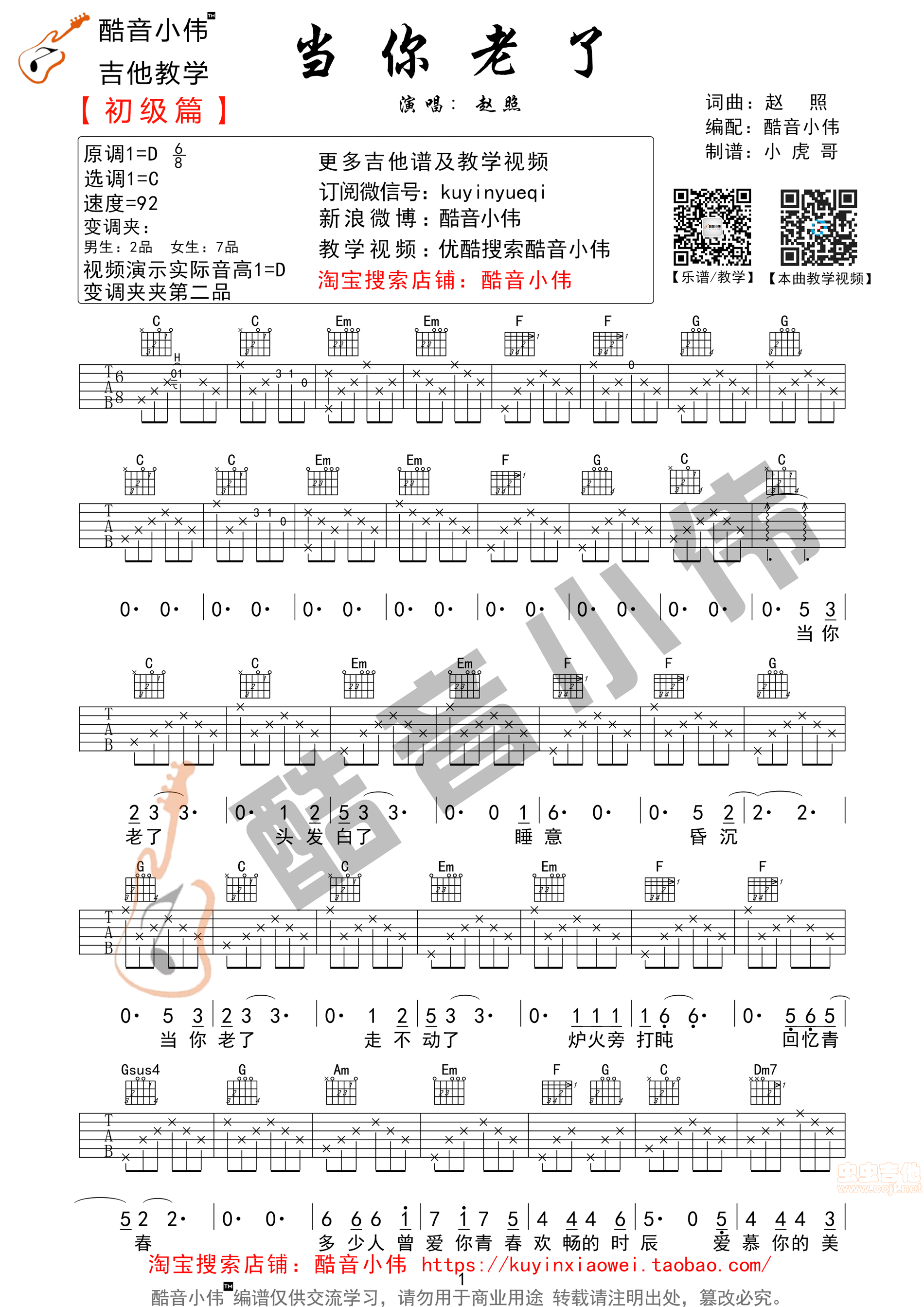 曲谱介绍: 《当你老了》吉他弹唱谱,采用C调指法编配原版,共有2张高清图谱,免翻页排版设计。