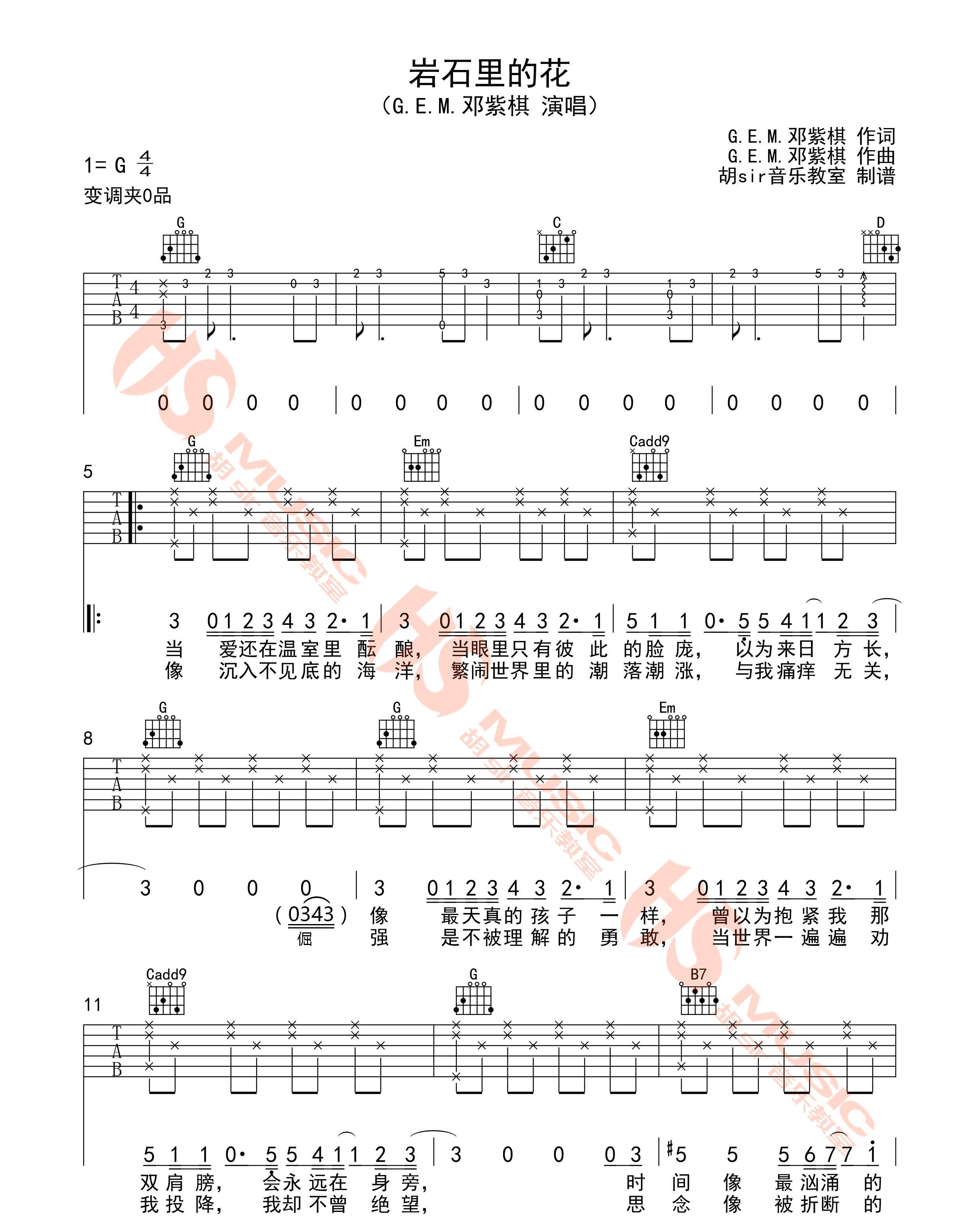 岩石里的花 邓紫棋 G调六线吉他谱 - 岩石里的花 - G调吉他弹唱谱