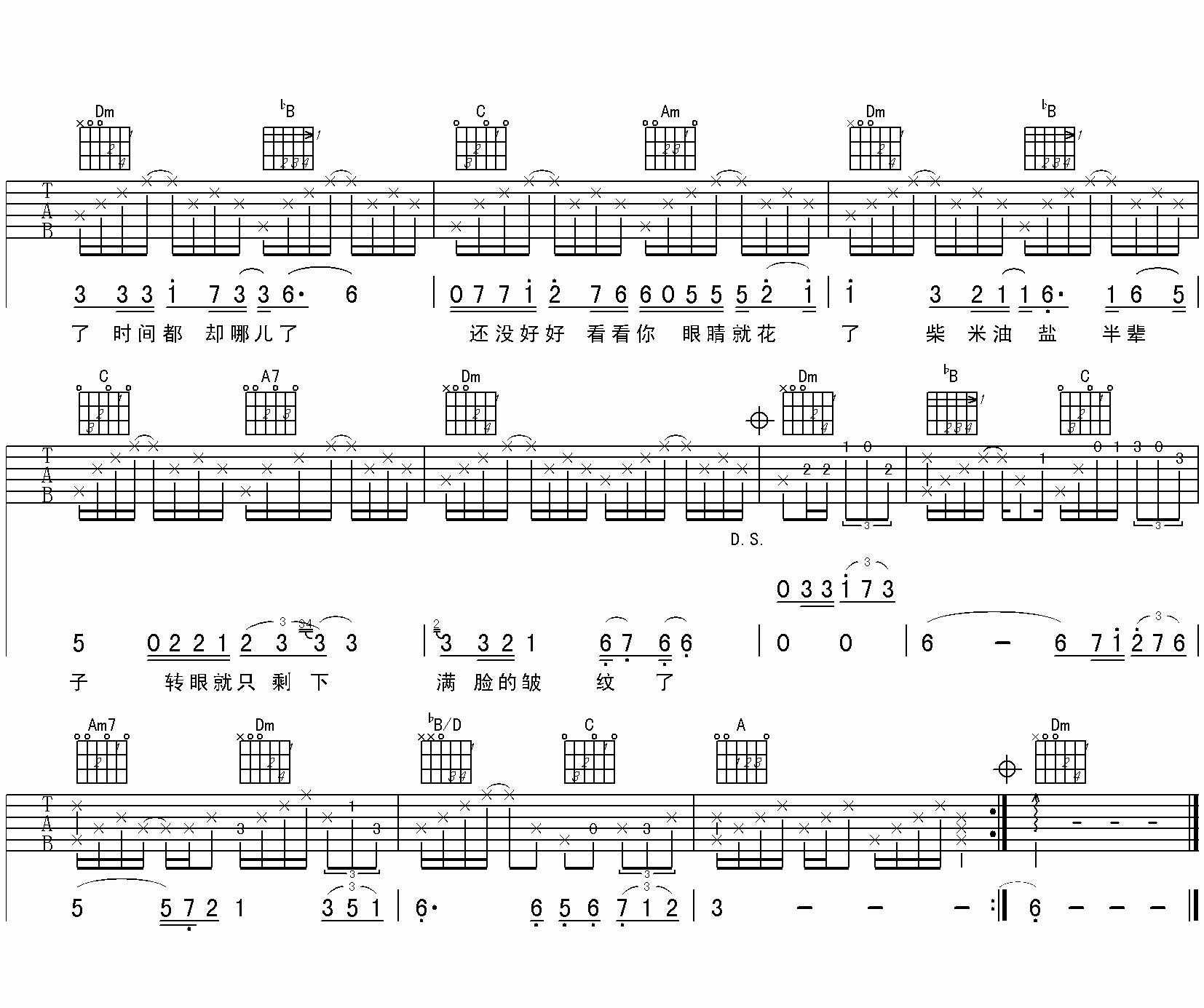 曲谱介绍: 时间都去哪儿了《时间都去哪儿了王铮亮F调图片》吉他弹唱谱,采用F调指法编配,共有2张高清图谱,免翻页排版设计。