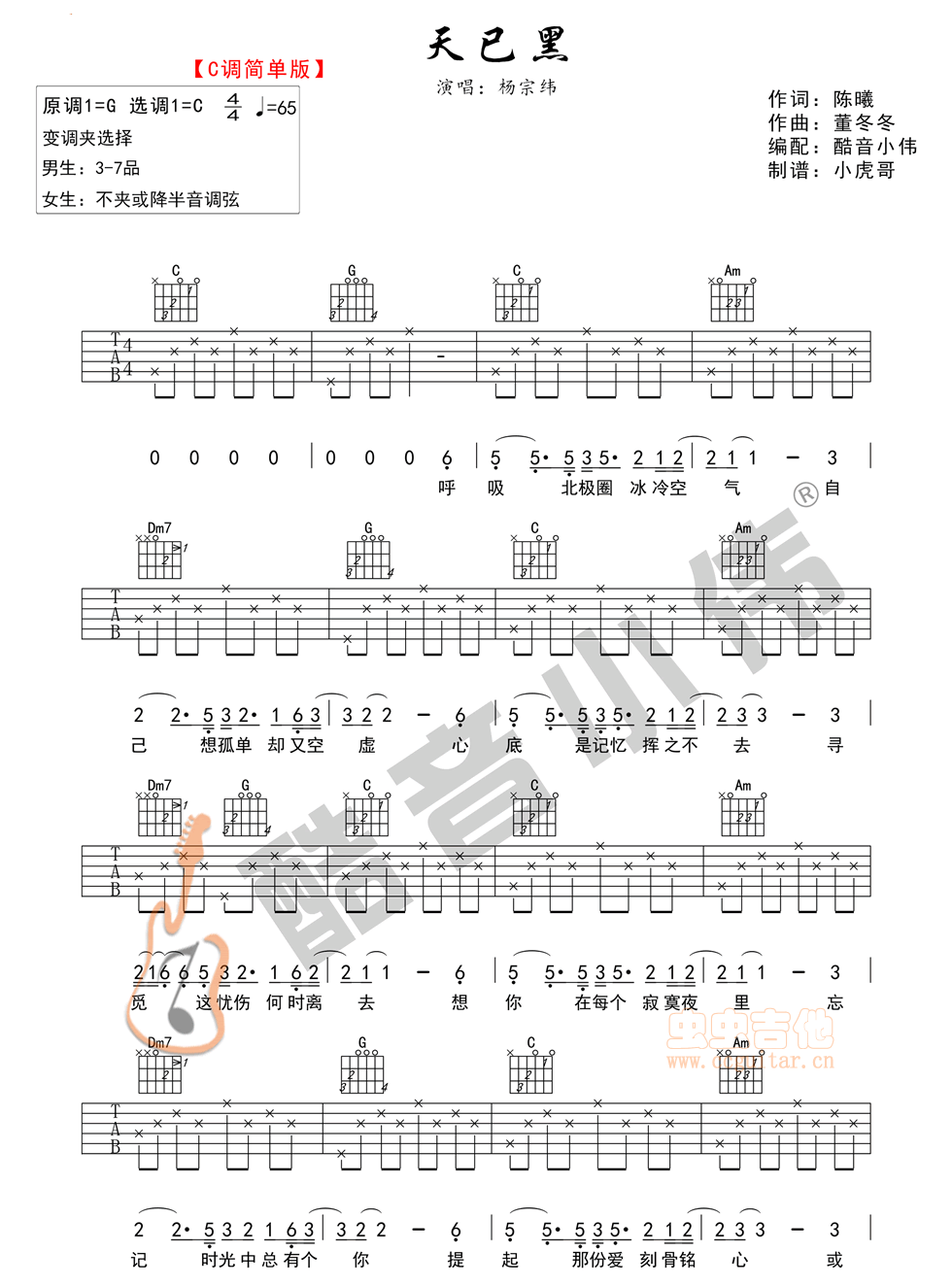 曲谱介绍: 天已黑《天已黑杨宗纬C调图片》吉他弹唱谱,采用C调指法编配,共有3张高清图谱。