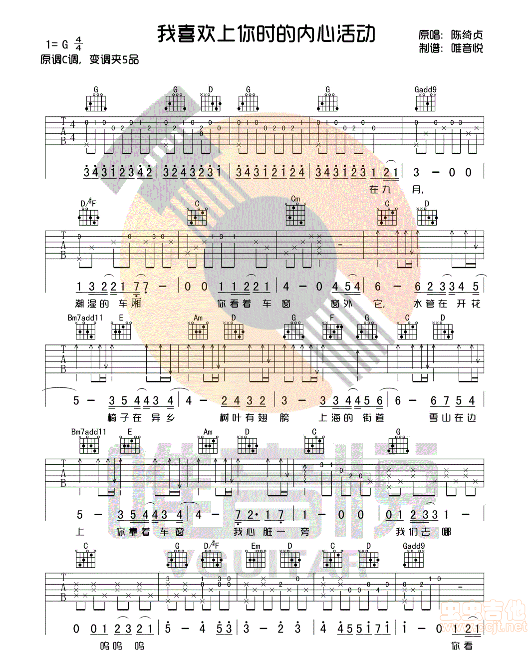 曲谱介绍: 我喜欢上你时的内心活动《我喜欢上你时的内心活动陈绮贞G调图片》吉他弹唱谱,采用G调指法编配,共有3张高清图谱。