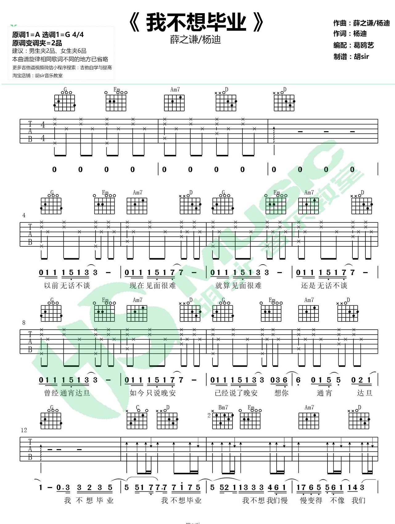 曲谱介绍: 我不想毕业《我不想毕业薛之谦/杨迪G调指法六线》吉他弹唱谱,采用G调指法编配,共有2张高清图谱,免翻页排版设计。