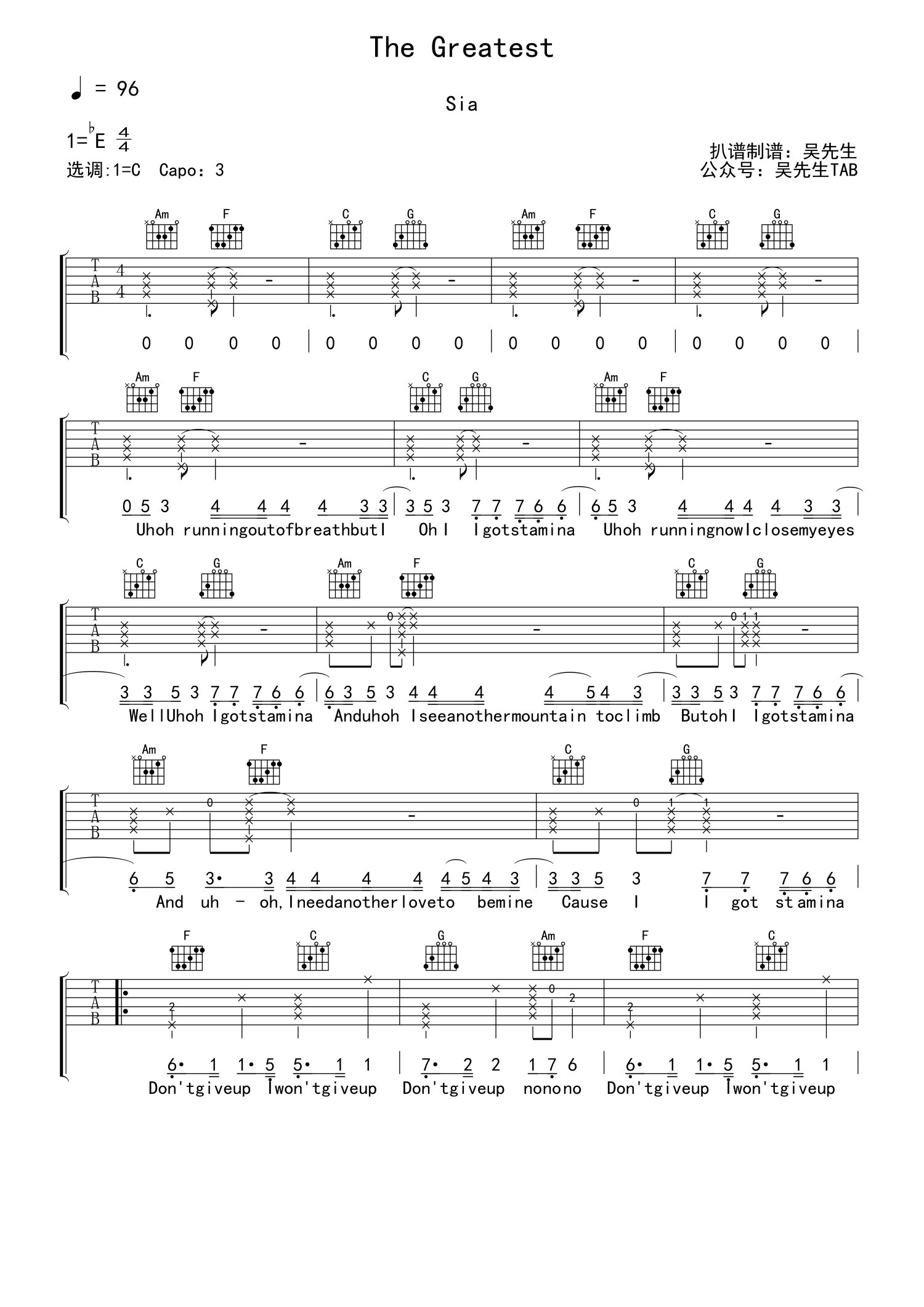 曲谱介绍: Sia《The Greatest》吉他谱_C调吉他弹唱谱
