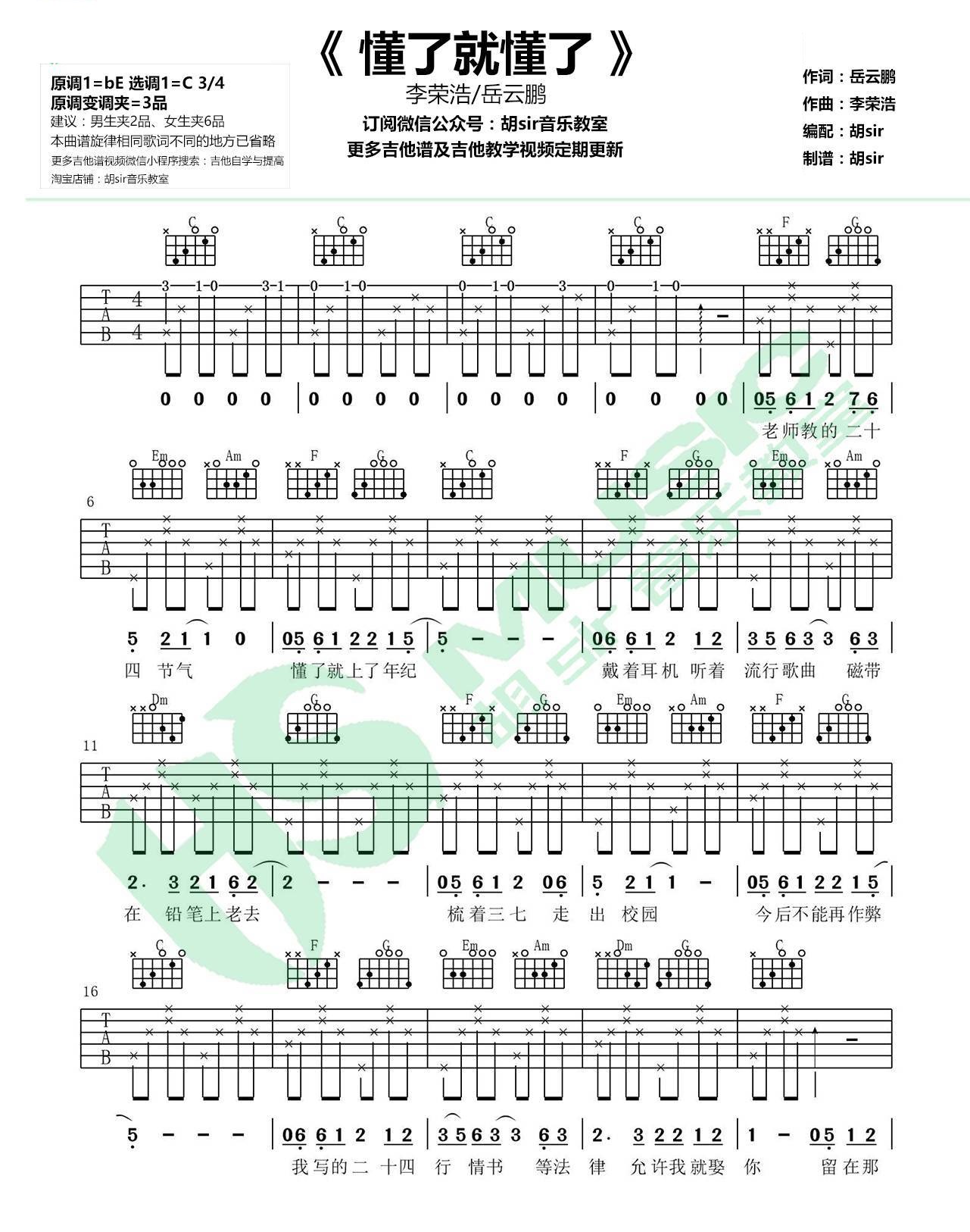 懂了就懂了 李荣浩/岳云鹏 C调伴奏六线吉他谱 - 懂了就懂了 - C调吉他弹唱谱