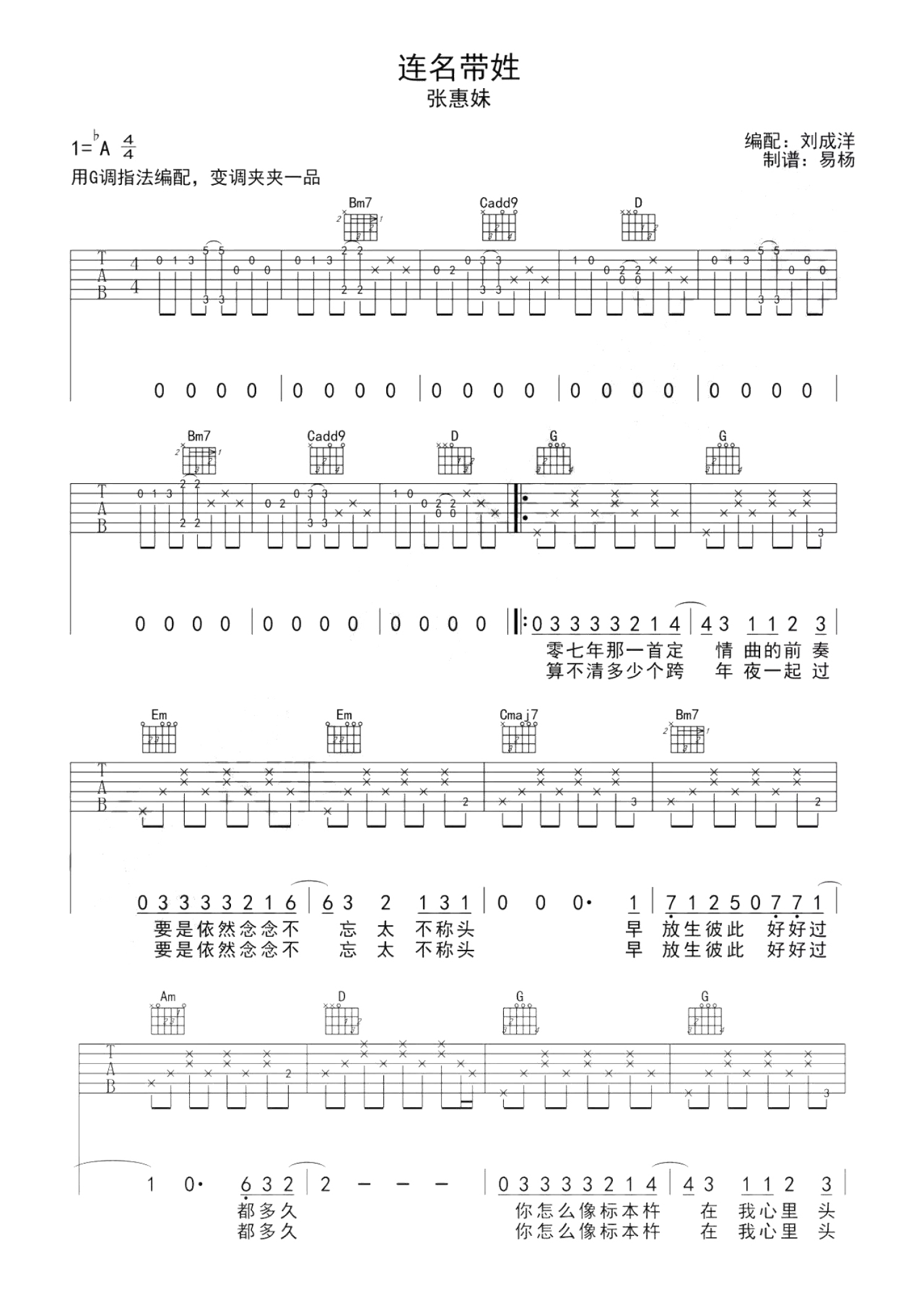 曲谱介绍: 《连名带姓》吉他谱_张惠妹_G调原版弹唱六线谱_高清图片谱分享,《连名带姓》是张惠妹演唱的歌曲,由葛大为作词,周杰伦作曲,这首歌唱出了每个人的爱情经历,撩拨着听众心里难忘的思念。该曲一开始,由寂寥沉静的钢琴悠扬开场,彷佛揭开了听众内心那段温热的感情,搭配张惠妹浓烈真切的演唱,把难以忘怀的情感描绘得深刻。歌词部分“我且爱且走,其实在等你,是最后的默契,要是我们又错过就别再回头”,让听众掉进思念的循环。