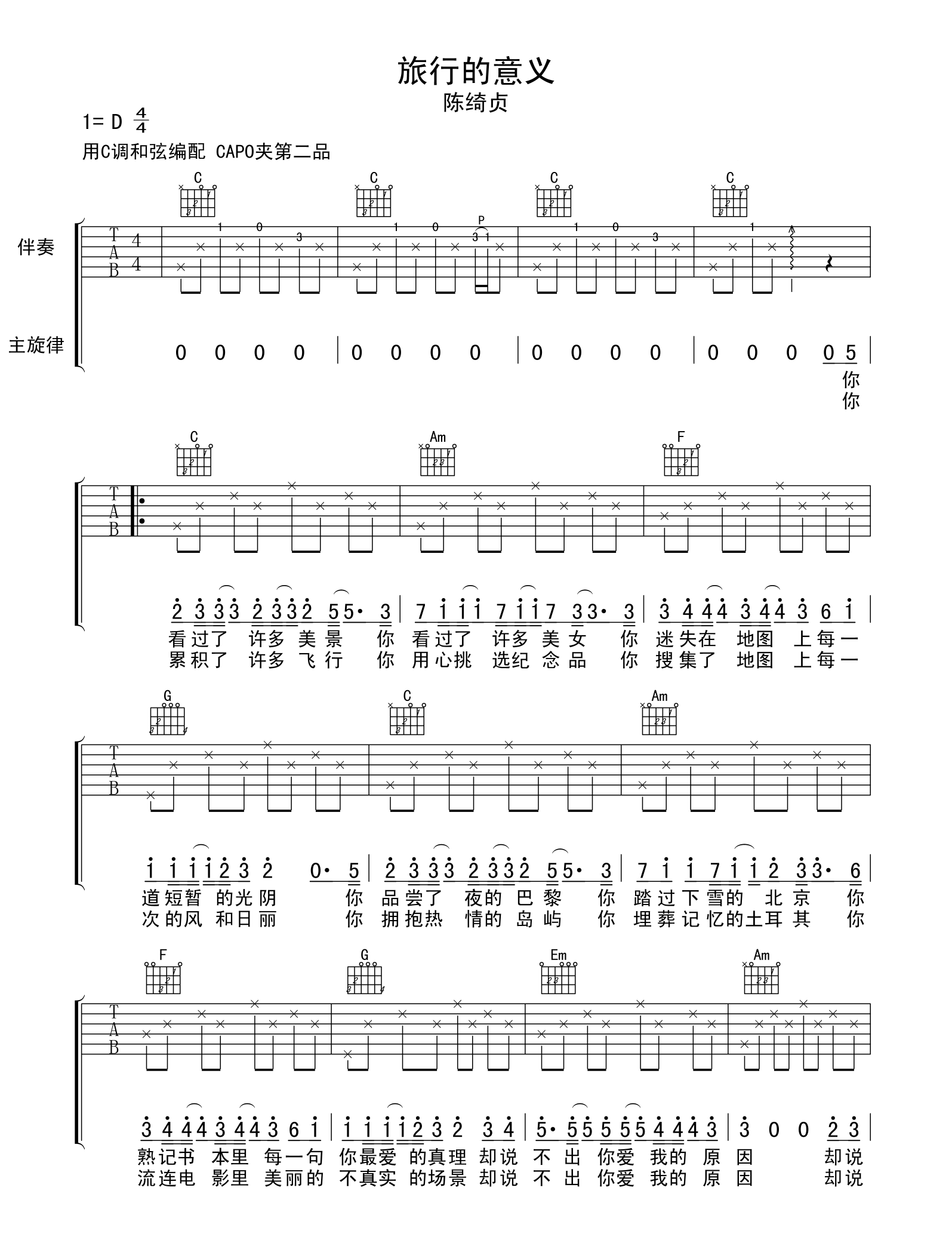 曲谱介绍: 旅行的意义《旅行的意义陈绮贞C调六线》吉他弹唱谱,采用C调指法编配,共有3张高清图谱。