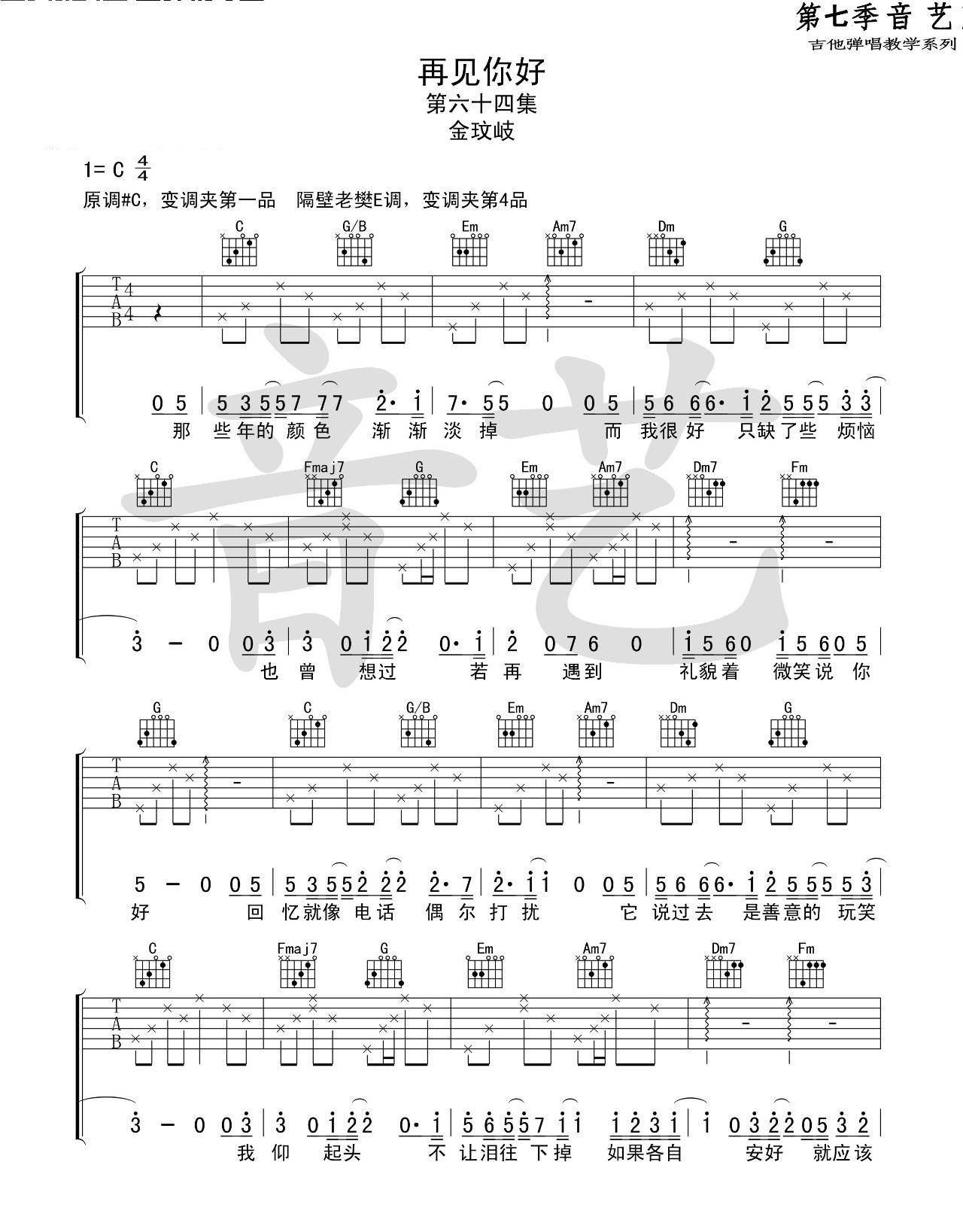 再见你好 金玟岐 C调伴奏吉他谱 - 再见你好 - C调吉他弹唱谱