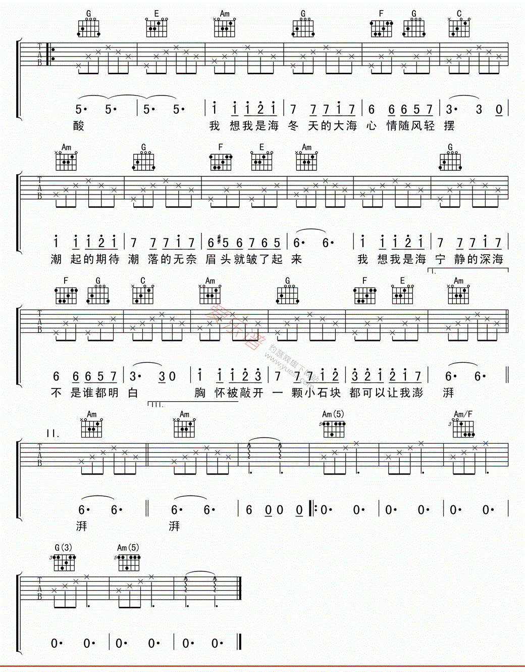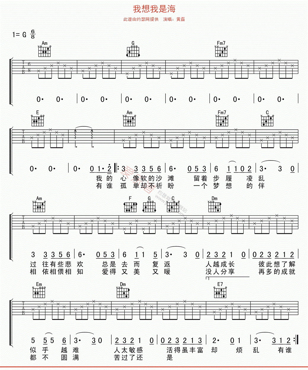 我想我是海 黄磊 G调完整版吉他谱 - 我想我是海 - G调吉他弹唱谱