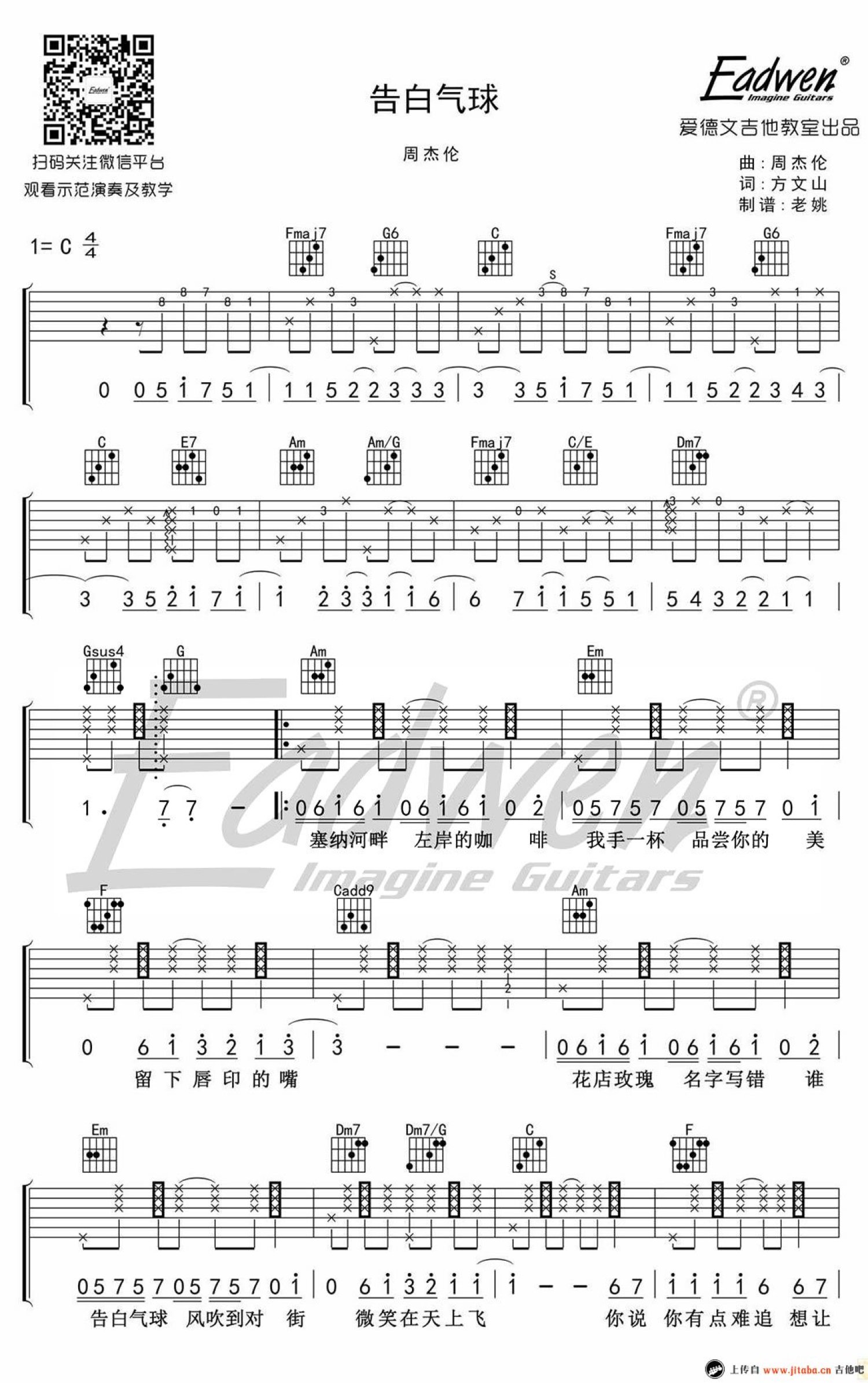 曲谱介绍: 周杰伦《告白气球》吉他谱_C调吉他弹唱谱