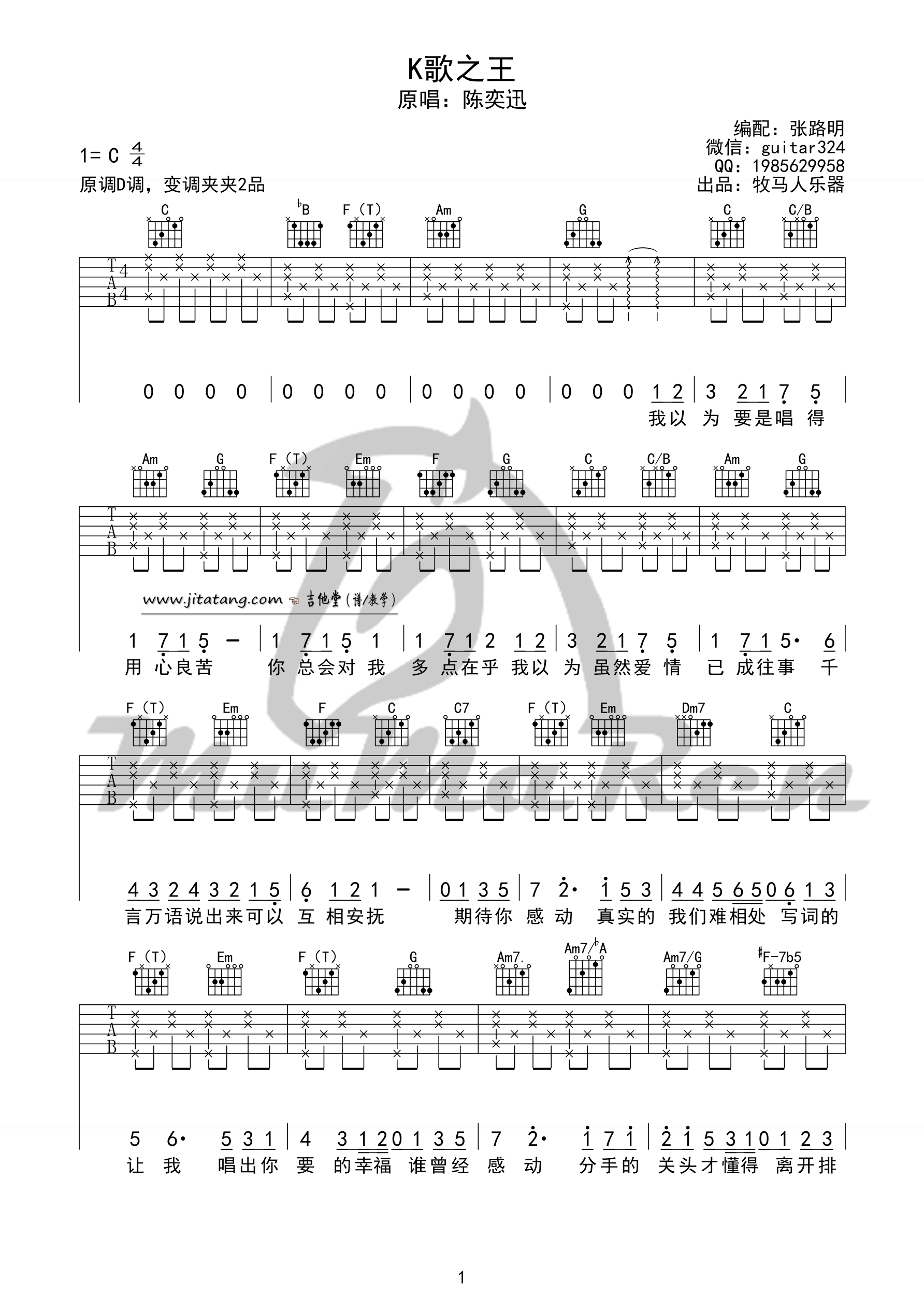 曲谱介绍: 《K歌之王》吉他谱分享,来自牧马人编配C调六线谱,陈奕迅的一首经典歌曲。歌曲在旋律上给人一种似曾相识的感觉,仔细听还有部分《卡农》的旋律,编曲上以扫弦和分解节奏型为基本和弦,弹奏时运用到了琶音的弹奏技巧。吉他谱比较长,而且转位的地方比较多,难度稍大。