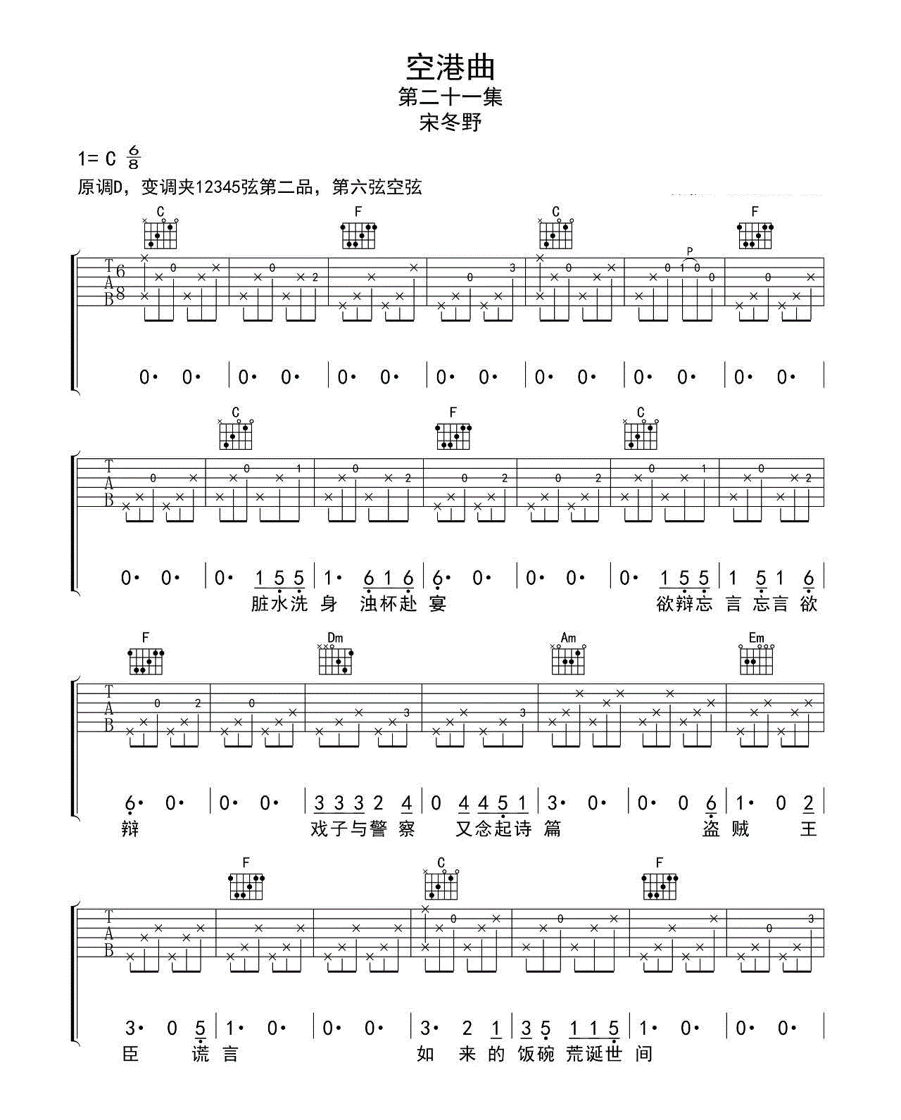 空港曲 宋冬野 C调六线吉他谱 - 空港曲 - C调吉他弹唱谱