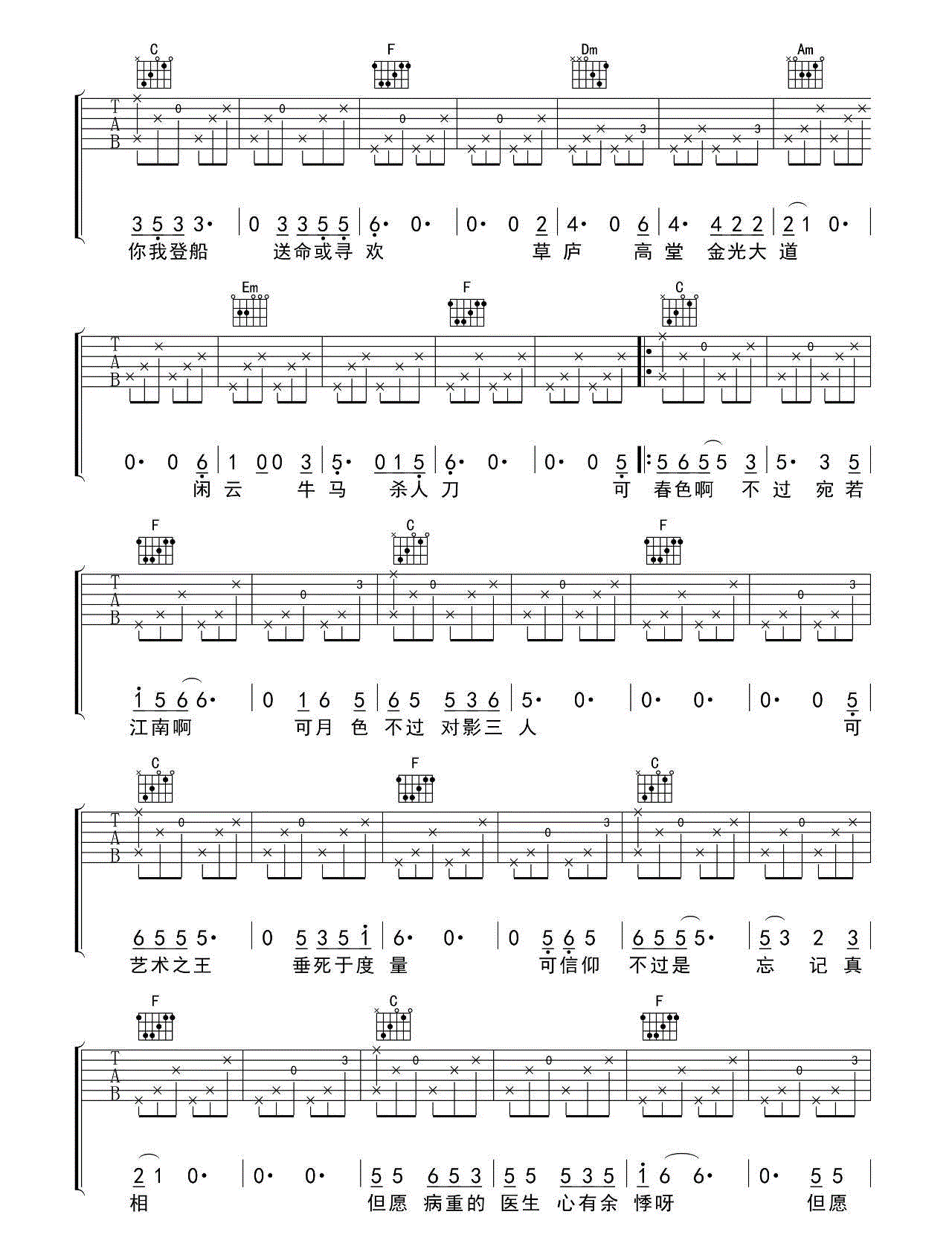 曲谱介绍: 宋胖子又玩深度啦,虽然现在出的歌曲没有之前那么朗朗上口,但是真的很喜欢,其实这首歌曲正式版出来的第二天就听了,但是伴奏主要用合成器做的,所以也就打消了做谱子的念头,今天突然听到了他的demo版,根本停不下来!所以花了5个小时,一口气做完了,基本上原版!网上现在可是没有的!虽然还是抢先版,但是忍不住先和各位琴友见面!    我没有看宋胖子的弹奏,有可能他是用的D调的指法,我正在做谱子的时候用的C调的指法,但是变调夹只夹12345弦的第2品,把第六弦放掉,让它还是空弦!这样Dm和弦的根音就到了第六弦啦,更加有厚重感,但是Em和弦的根音就需要左手食指压六弦第三品,如果手大用左手大拇指反扣也可以!谱子后期会另外标注上去。(暂时只是抢先版)