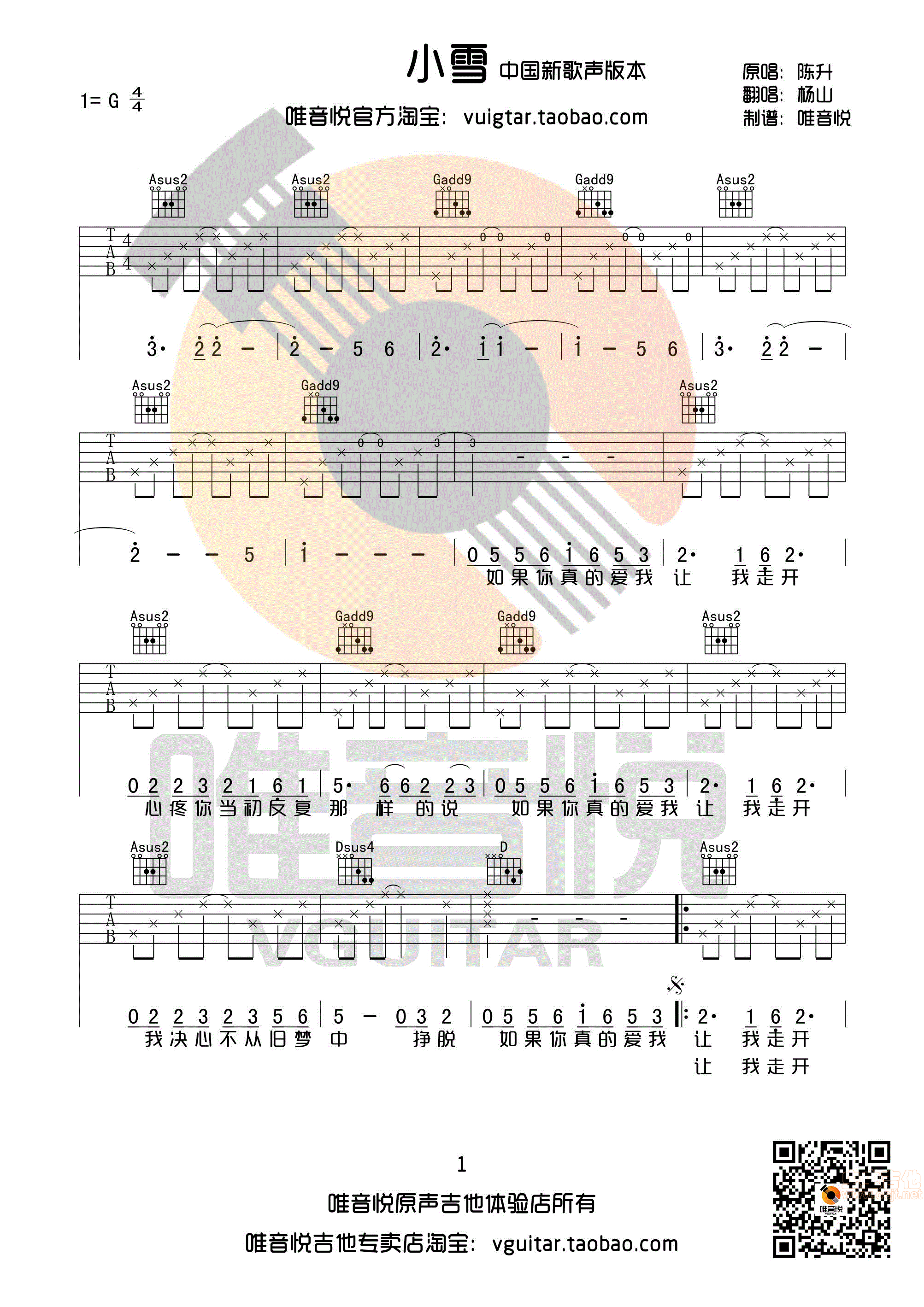 曲谱介绍: 小雪《小雪杨山中国新歌声G调完整版简单版》吉他弹唱谱,采用G调指法编配,共有4张高清图谱。