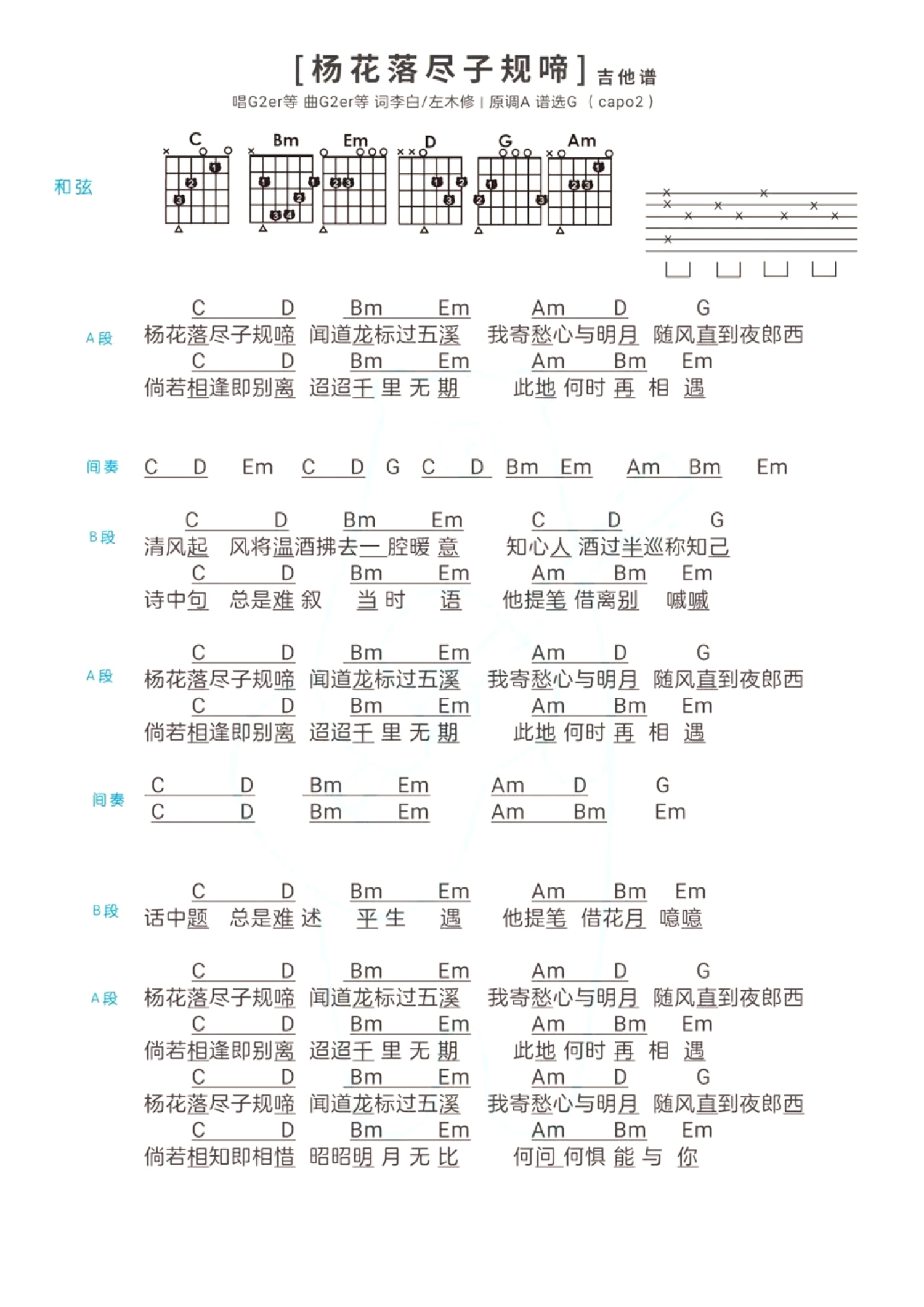 曲谱介绍: 黄诗扶/G2er《杨花落尽子规啼》吉他谱_G调吉他弹唱谱_和弦谱