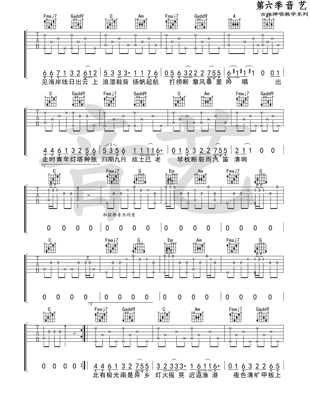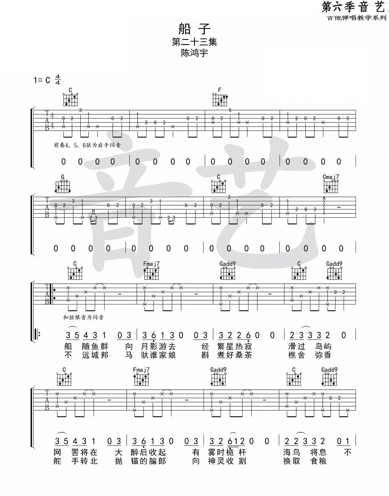 当前位置:琴谱网>吉他弹唱>船子 陈鸿宇 C调六线