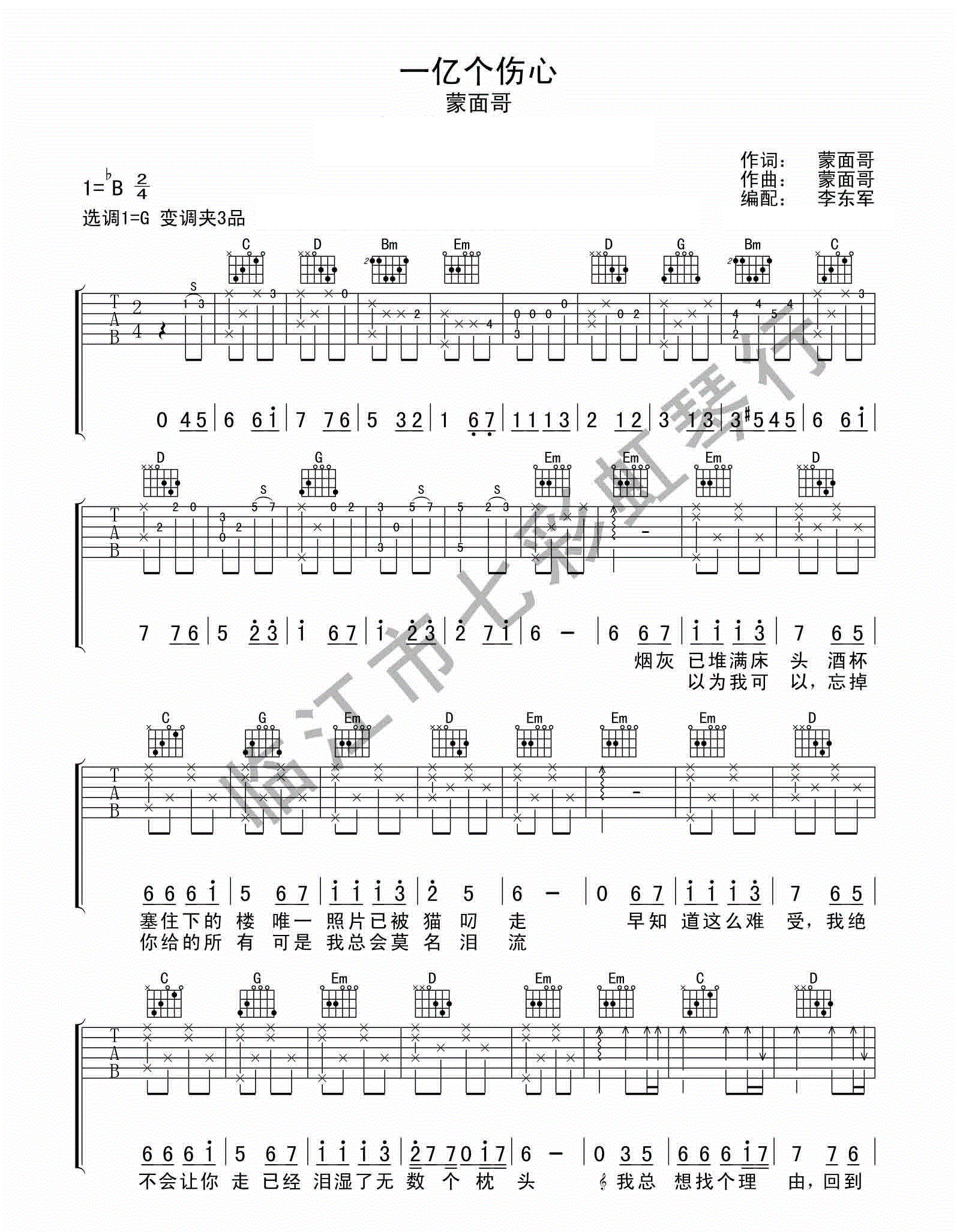 一亿个伤心 蒙面哥 G调六线吉他谱 - 一亿个伤心 - G调吉他弹唱谱