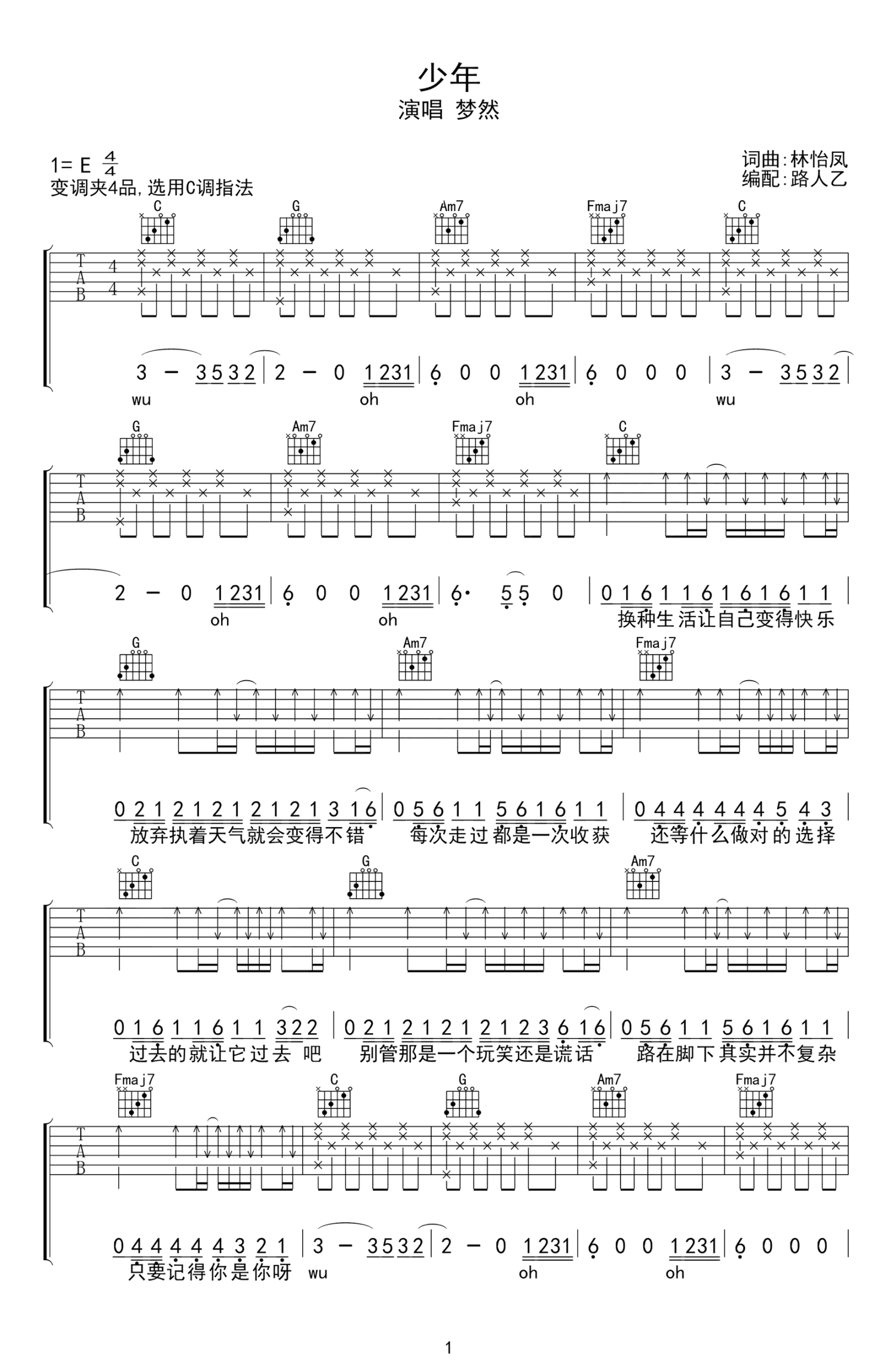 少年吉他谱 - 梦然 - C调吉他弹唱谱