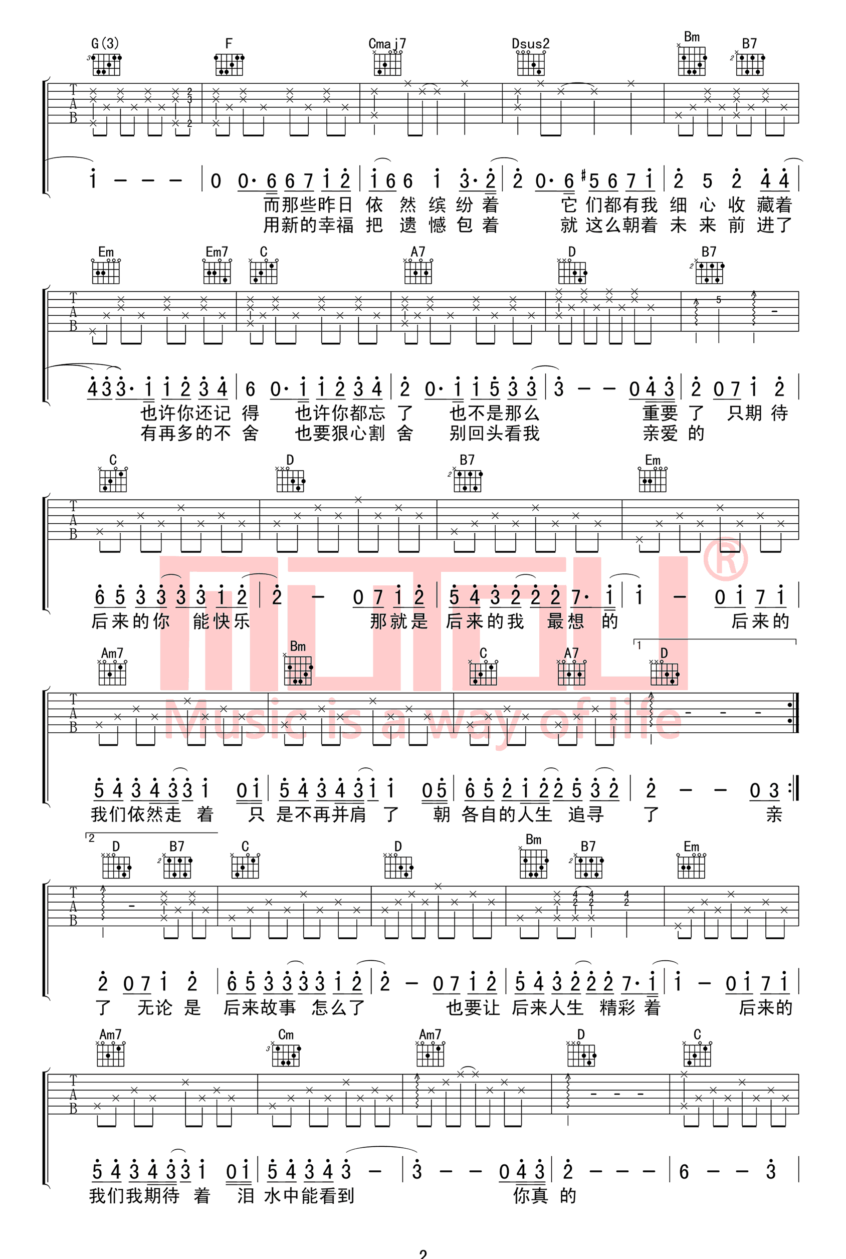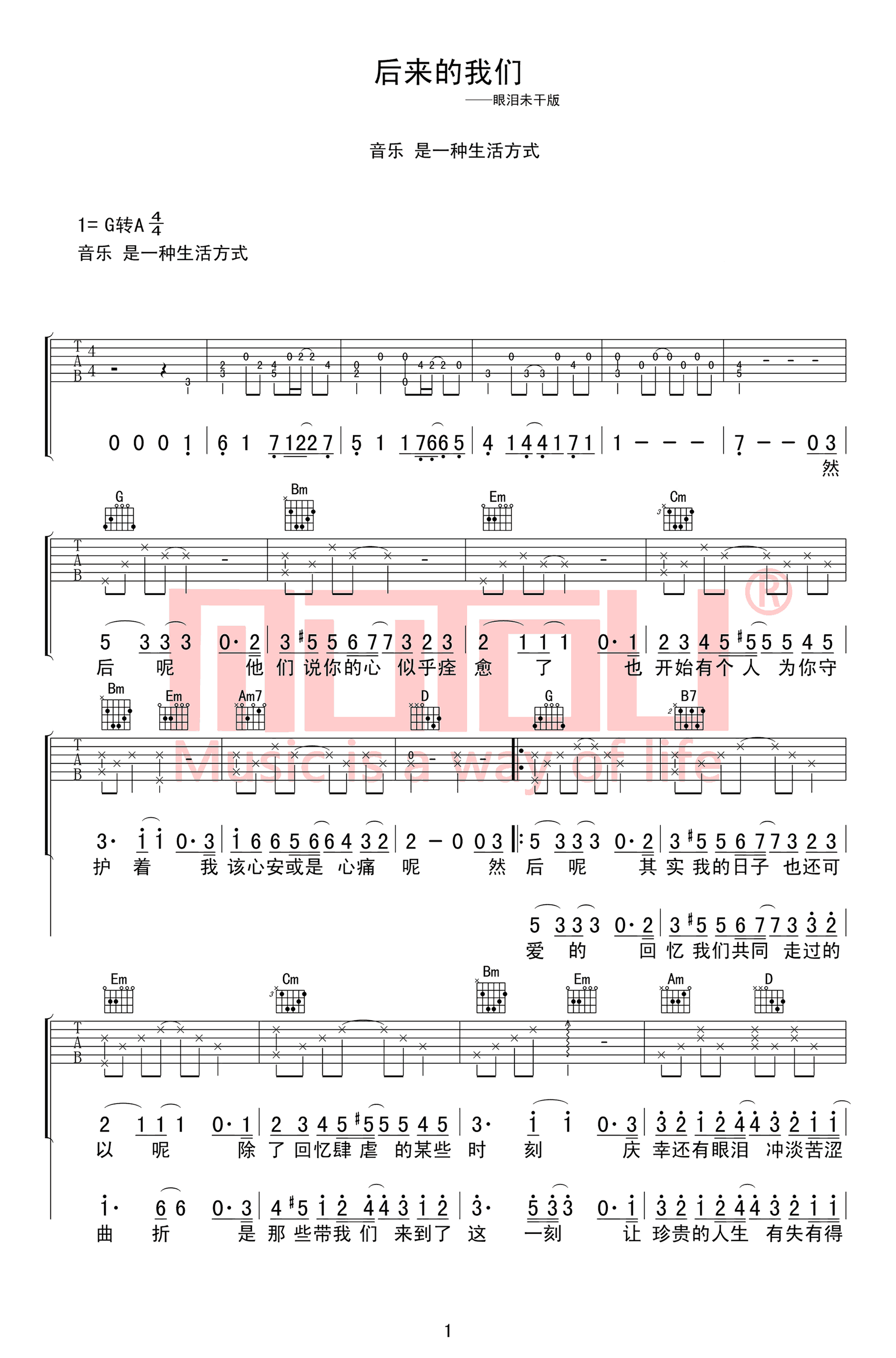 曲谱介绍: 后来的我们吉他谱,眼泪未干版,G转A调,五月天演唱电影《后来的我们》同名主题曲,三张弹唱图片谱,六线谱由木头吉他屋编配出品,琴谱网网站上传。 五月天重新编曲,眼泪未干深情演绎《后来的我们》,情怀可以是静静流淌,也可以是汹涌澎湃。重要的是用心面对,尽力,无所保留。因为无论是后来故事怎么了,也要让后来人生精彩着。