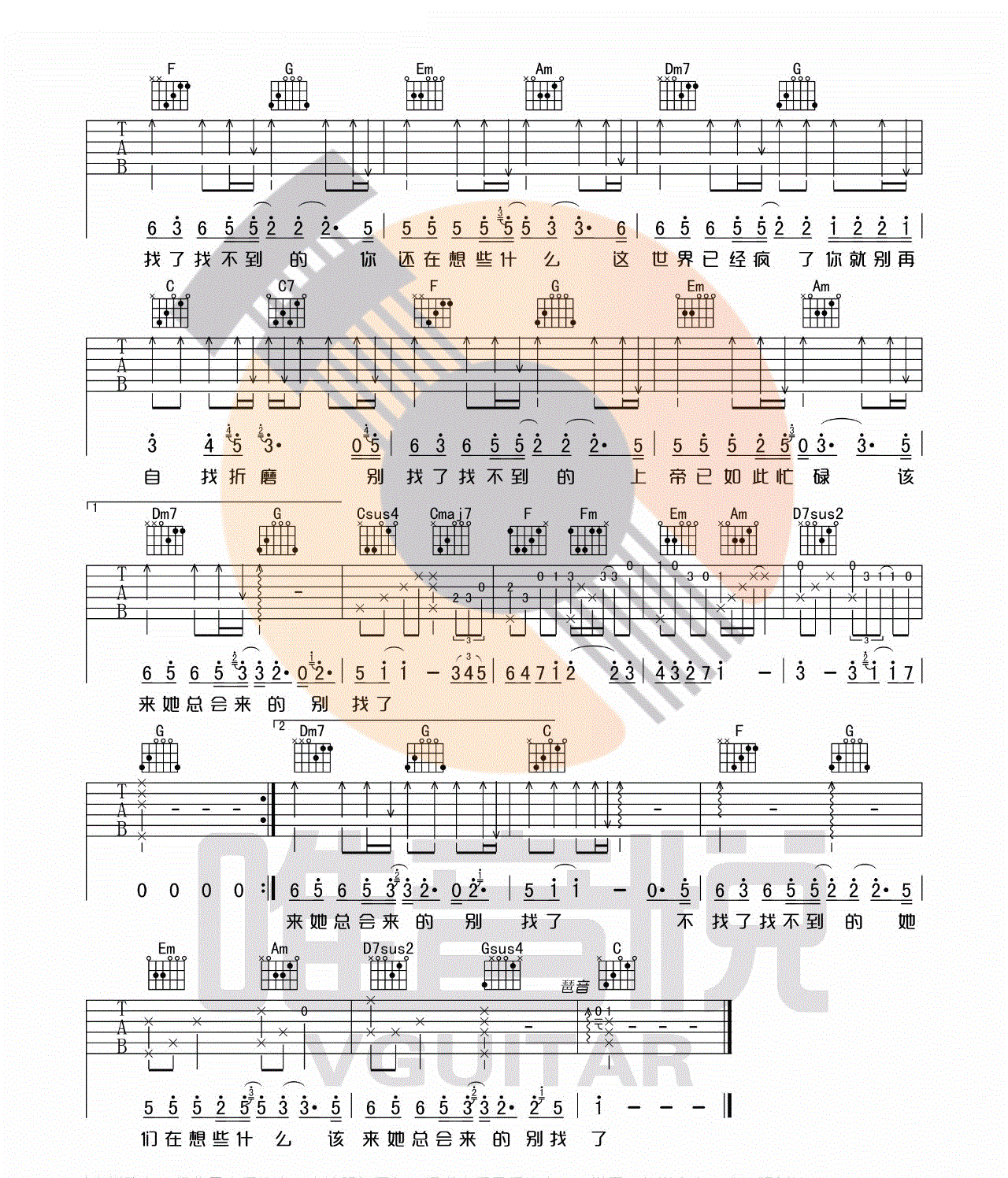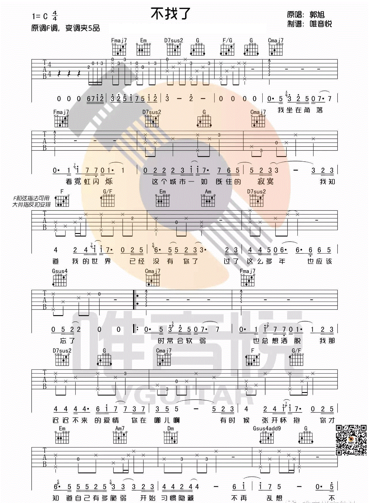 不找了 郭旭 C调六线吉他谱 - 不找了 - C调吉他弹唱谱
