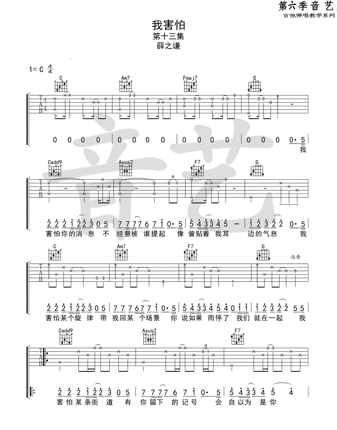 我害怕 薛之谦 C调六线吉他谱 - 我害怕 - C调吉他弹唱谱