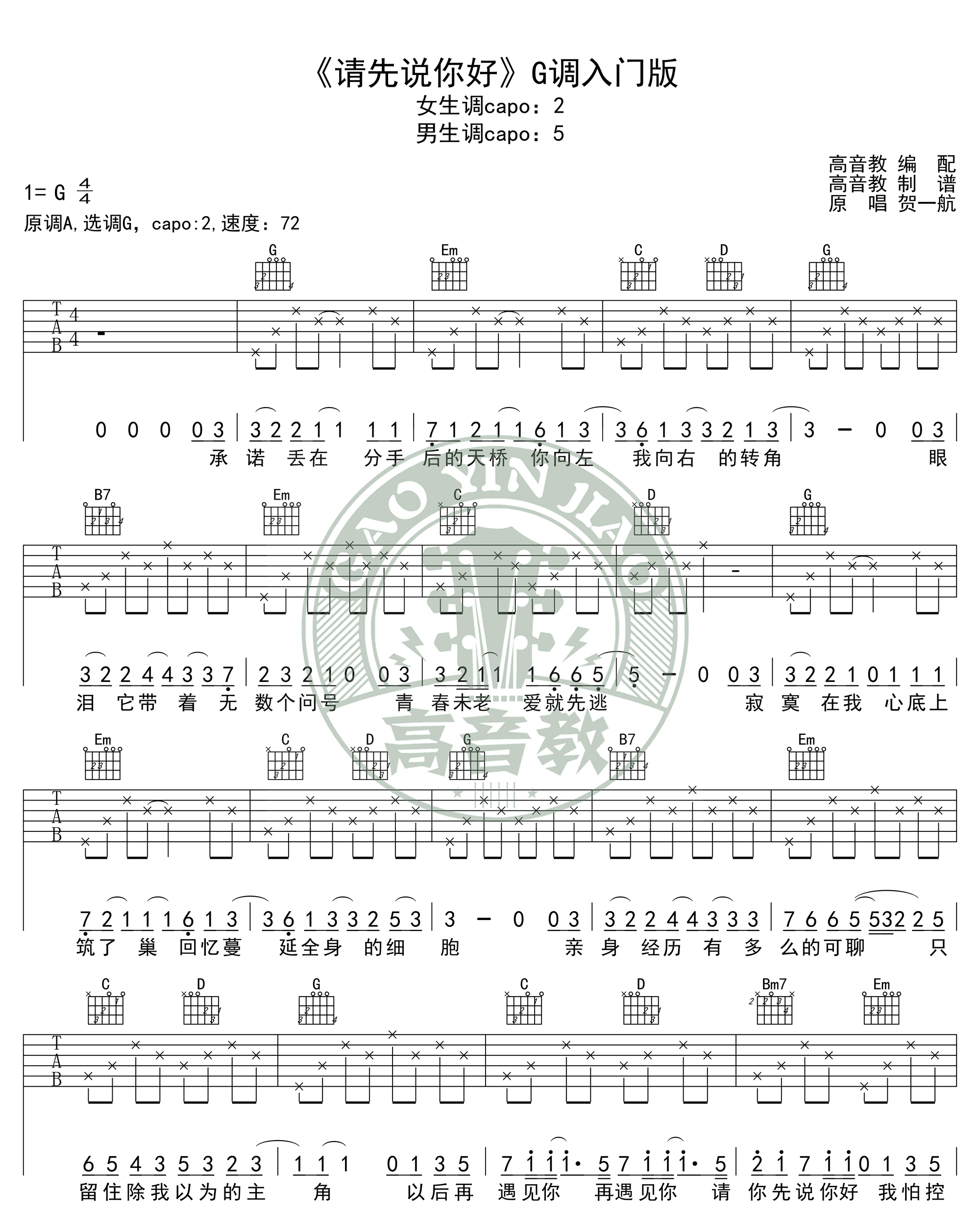 请先说你好 贺一航 G调入门版吉他谱 - 请先说你好 - G调吉他弹唱谱