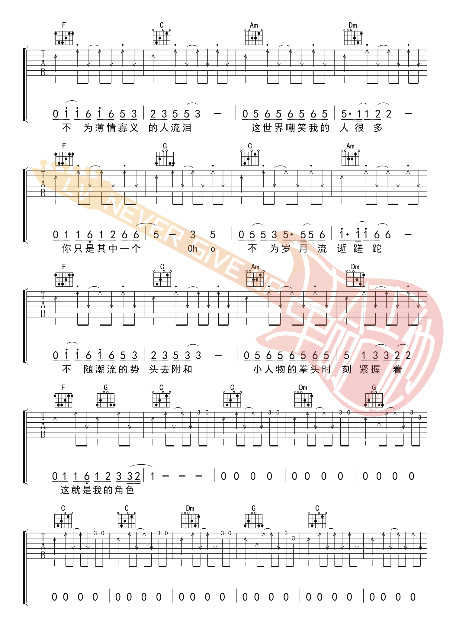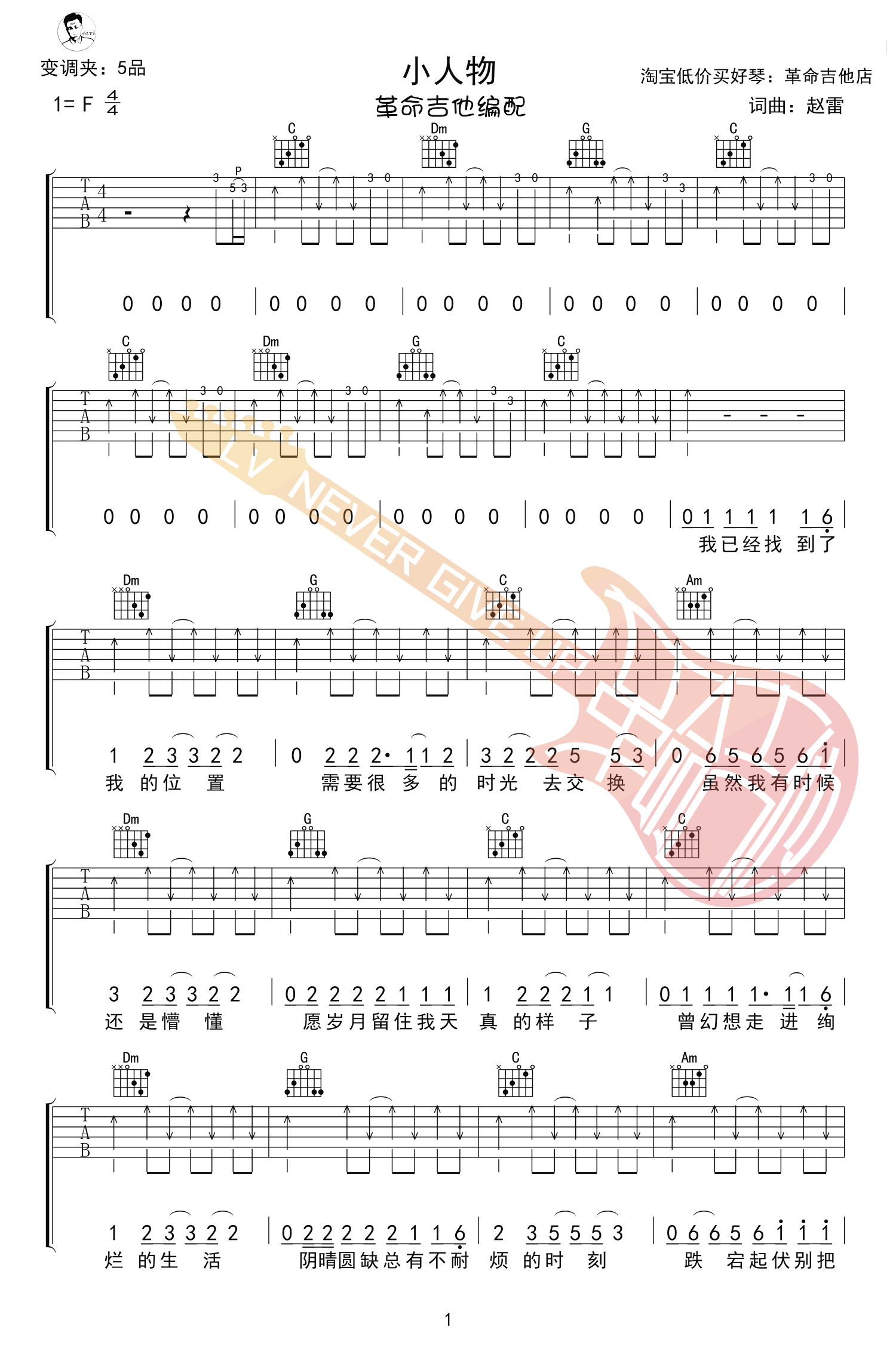 曲谱介绍: 赵雷《小人物》吉他谱,原调F,选用C调指法,变调夹夹五品。赵雷2495巡演新歌完整版,小人物六线谱,高清弹唱谱共五张图片谱例。感谢革命吉他编配出品。