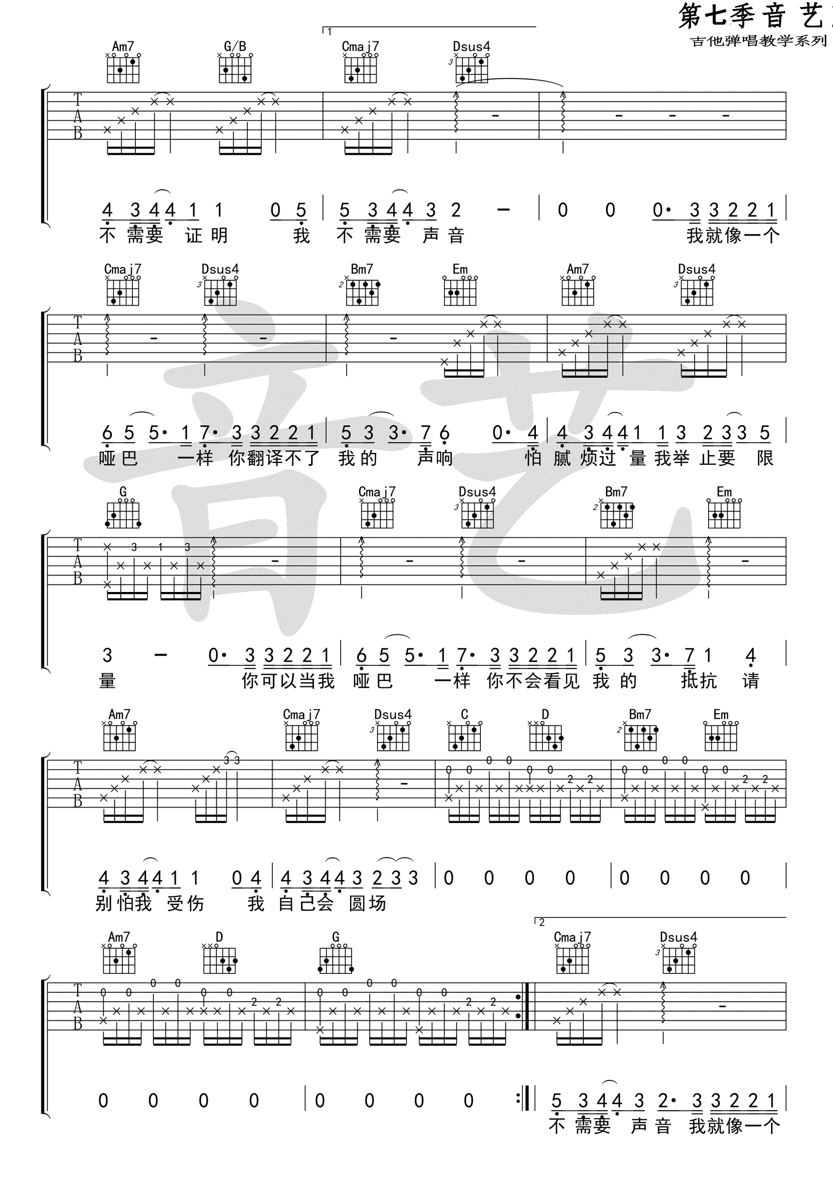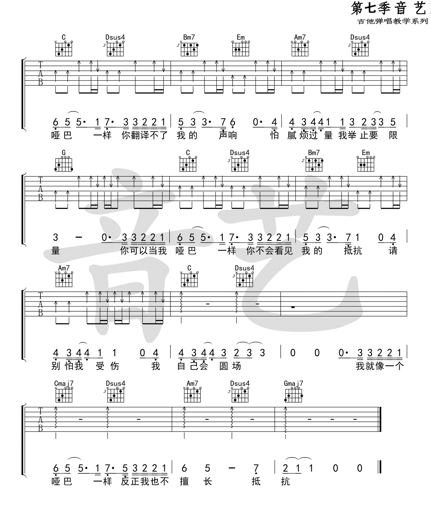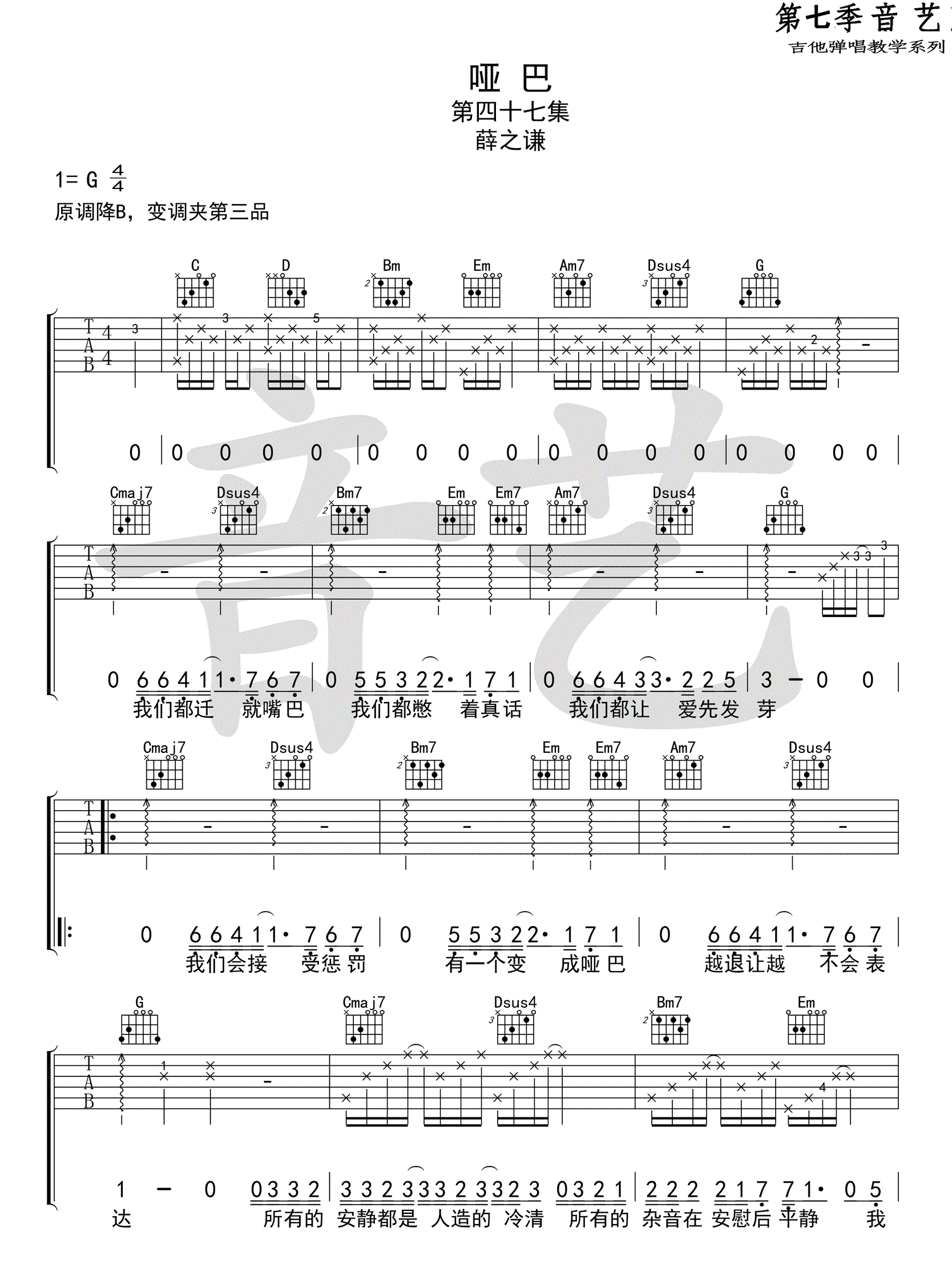 曲谱介绍: 薛之谦《哑巴》吉他谱,原调降B,变调夹夹第三品,选用G调指法编配。歌曲由汪苏泷词曲刘维原唱,经过薛之谦重新编曲填词的二次创作。哑巴吉他弹唱谱,高清图片六线谱。 所有的安静都是人造的冷清,所有的杂音在安慰后平静。一首忧伤的情歌,唱出感情中失语者的独白。