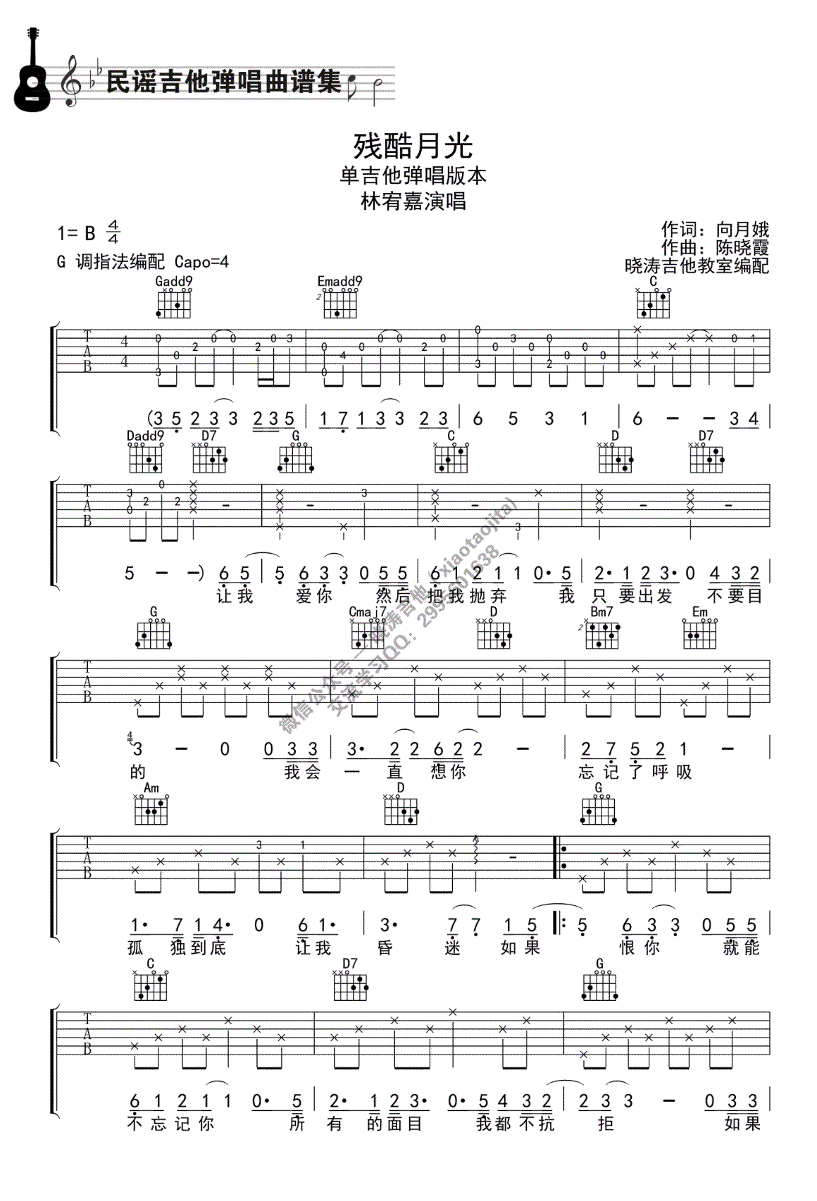 曲谱介绍: 林宥嘉《残酷月光》吉他谱,原调B,选用G调指法编配,CAPO夹四品,残酷月光六线谱。没有梦想何必远方,林宥嘉总能把歌曲唱出一种极致的孤独美感,一首很有味道、适合静静弹唱聆听de歌。整首歌曲难度不大,除了有几个横按,主要是前奏需要多加练习。祝大家玩琴愉快。