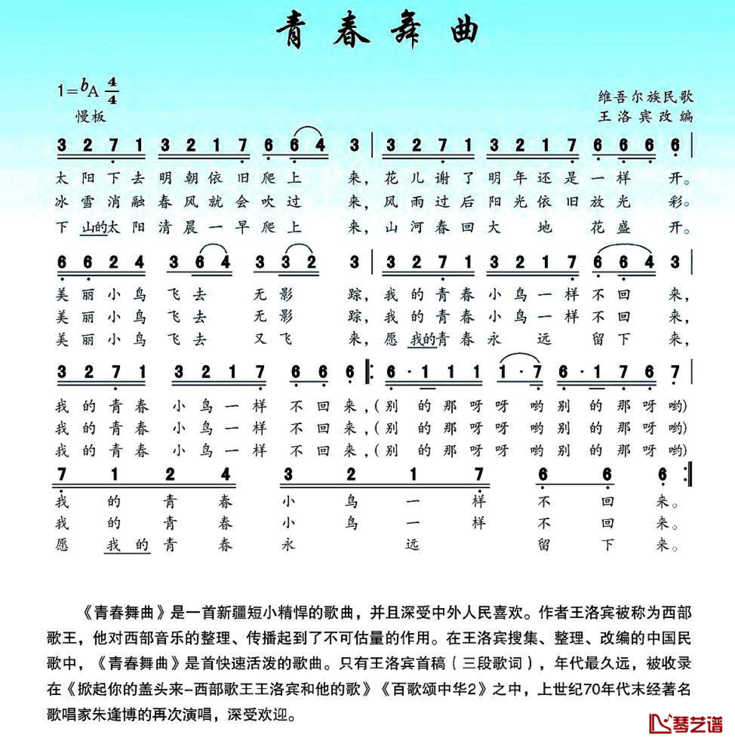 曲谱介绍: 维吾尔族民歌《青春舞曲》歌词_简谱