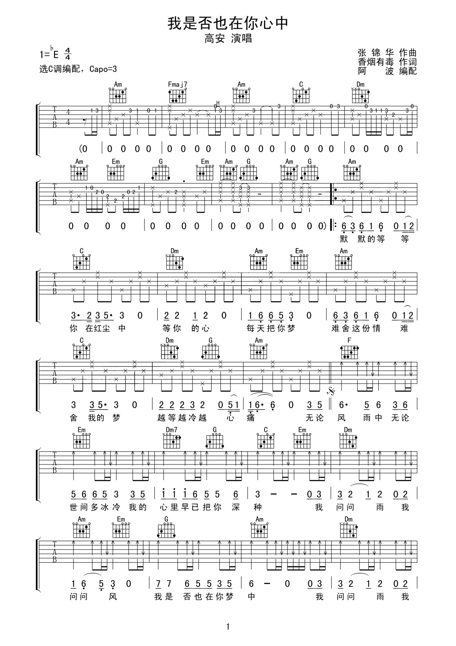 曲谱介绍: 网络歌手《我是否也在你心中》吉他谱_C调吉他弹唱谱