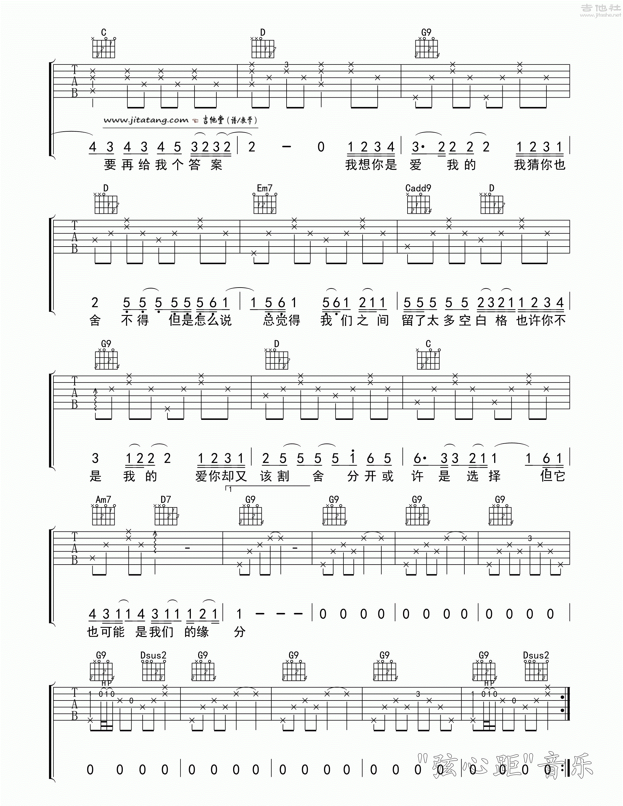 曲谱介绍: 《空白格》高清吉他谱,来自弦心距编配的G调伴奏谱,歌曲缓慢抒情,在弹奏的时候应该注意轻重音的变化以便更好的表现情绪。变调夹自己可以灵活处理,以自己的声线为准。