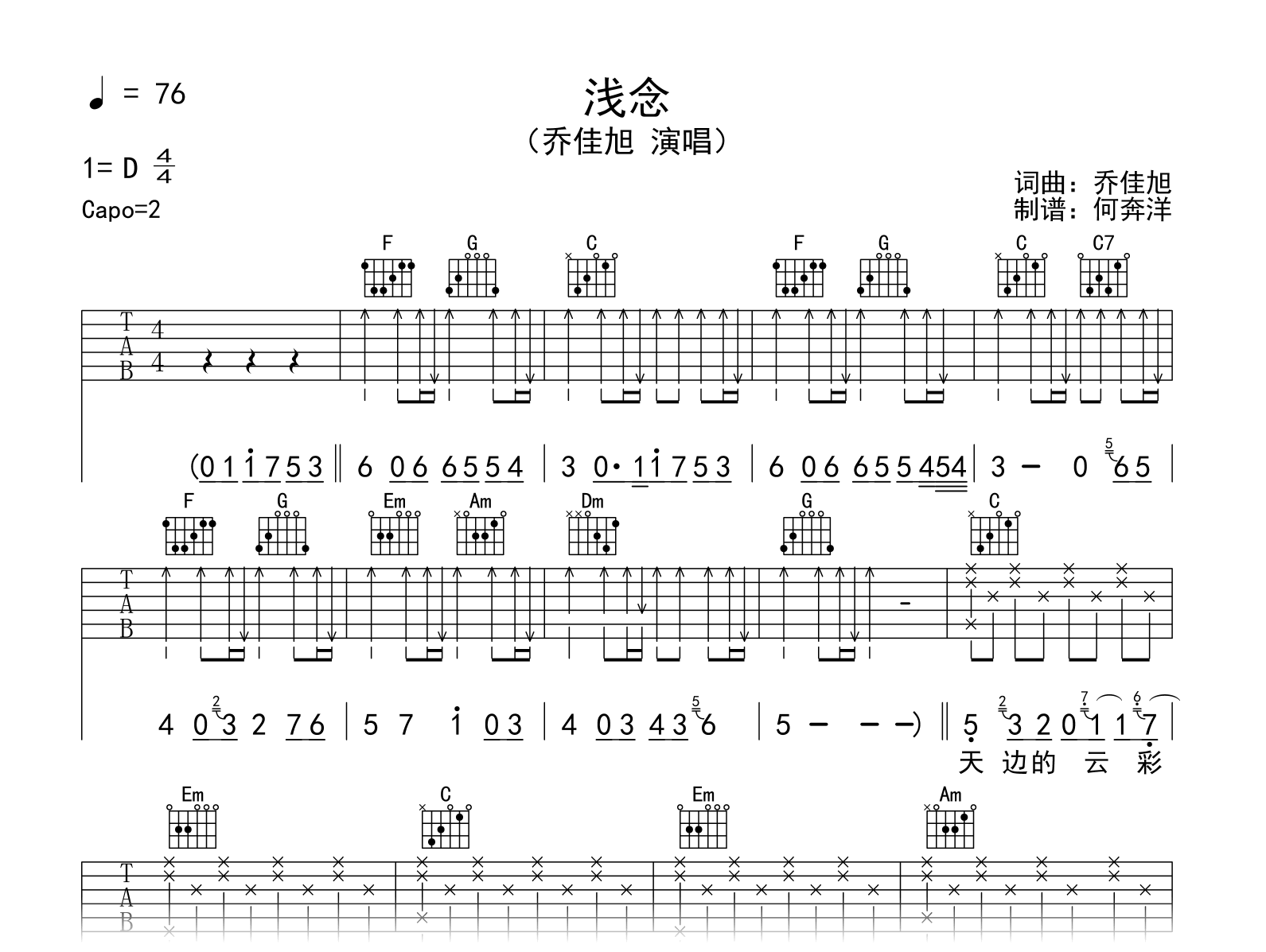 浅念吉他谱 - 乔佳旭 - C调吉他弹唱谱