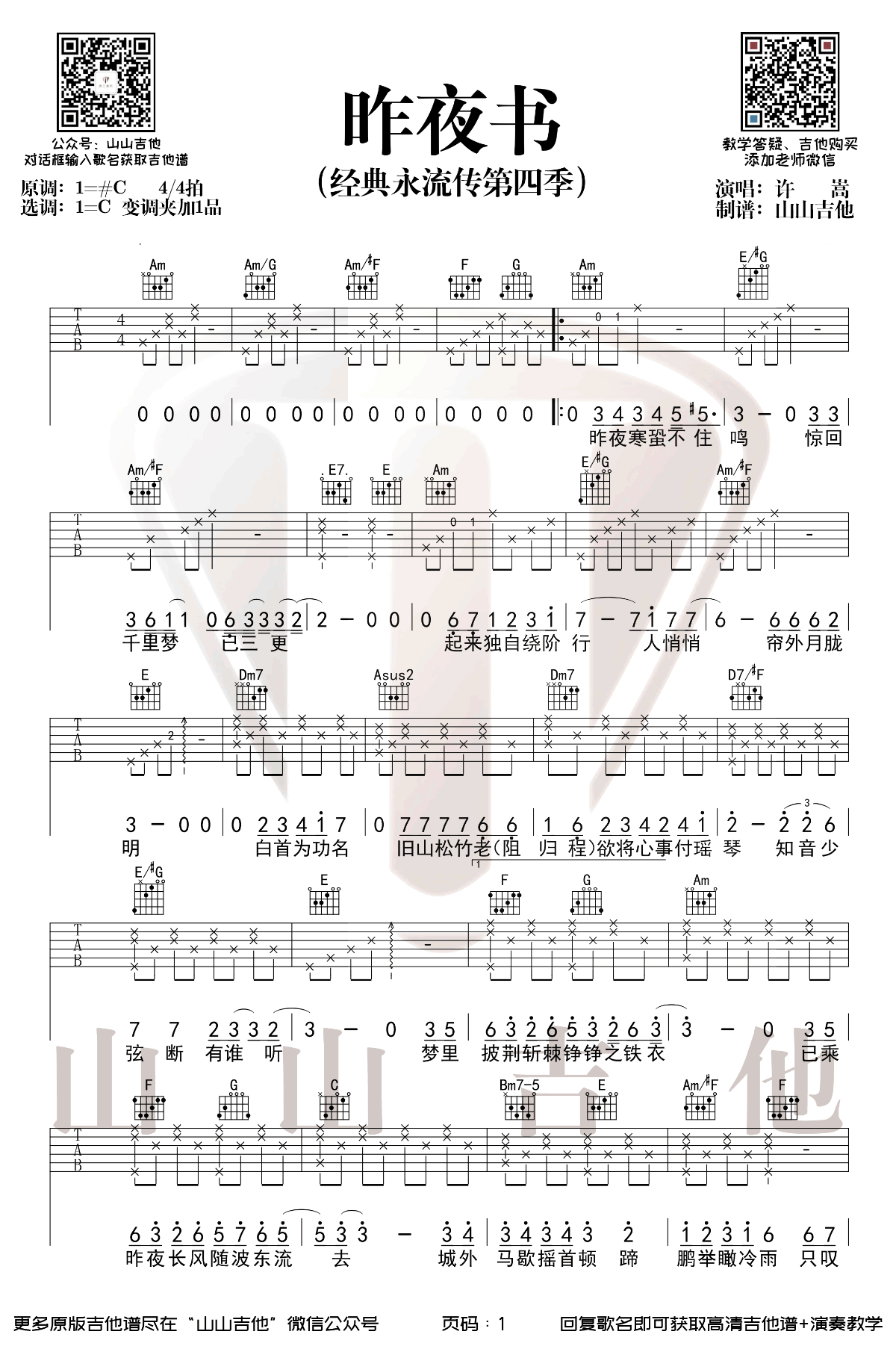 曲谱介绍: 许嵩《昨夜书》吉他弹唱谱,共有2张高清图谱,免翻页排版设计。