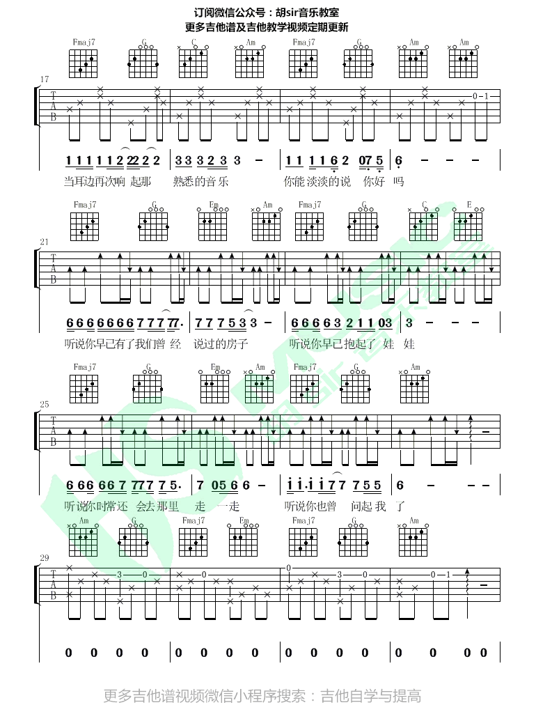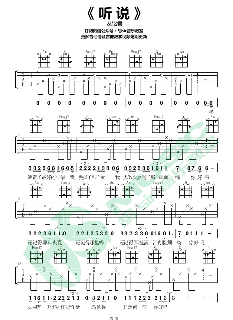 曲谱介绍: 丛铭君《听说》吉他谱,容易上手版本,原调D,选调C,变调夹夹二品,建议女生夹6品。一首触动人心的伤感歌曲,听说吉他弹唱谱,胡sir音乐教室编配。