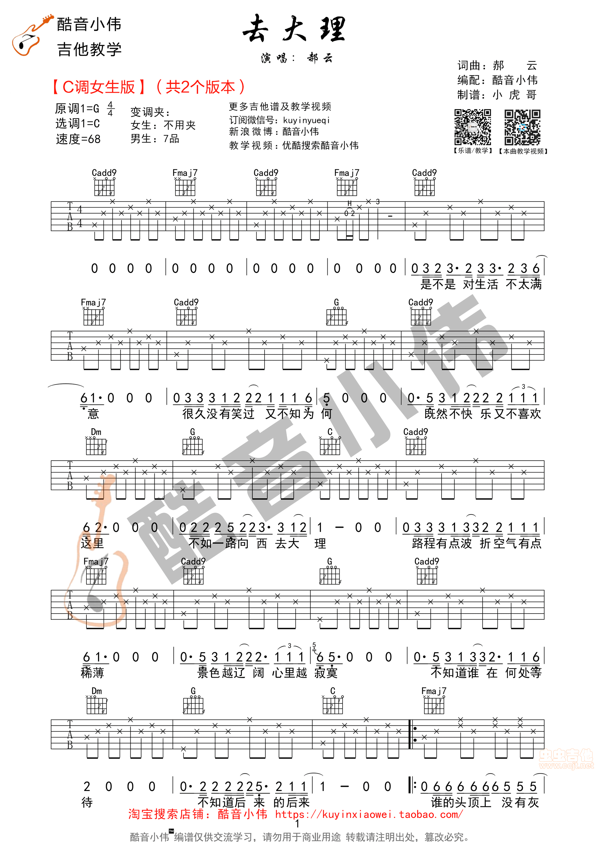 曲谱介绍: 《去大理》吉他弹唱谱,采用C调指法编配,共有2张高清图谱,免翻页排版设计。