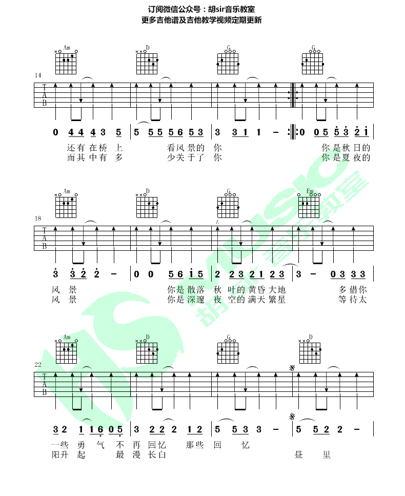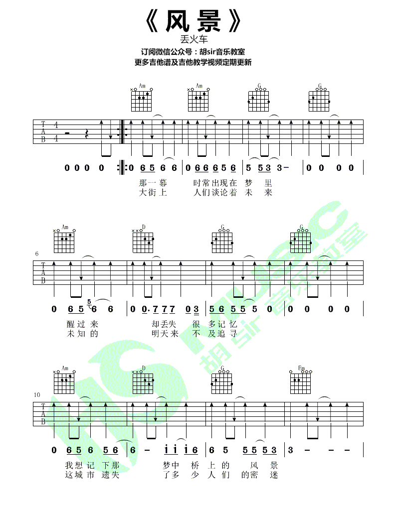 曲谱介绍: 风景吉他谱,丢火车乐队演唱,《我站在桥上看风景》电视剧片头曲,原调bB调,选G调指法,变调夹夹三品,风景六线谱,感谢胡Sir音乐教室出品。