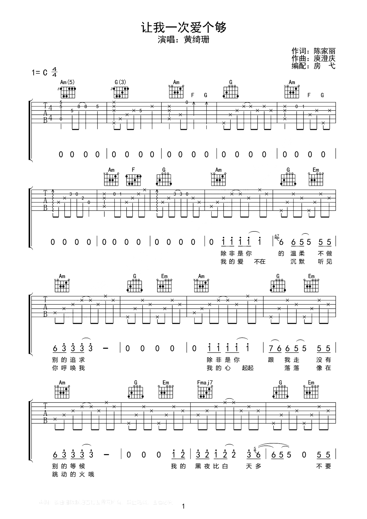 曲谱介绍: 庾澄庆《让我一次爱个够》吉他谱_C调吉他弹唱谱