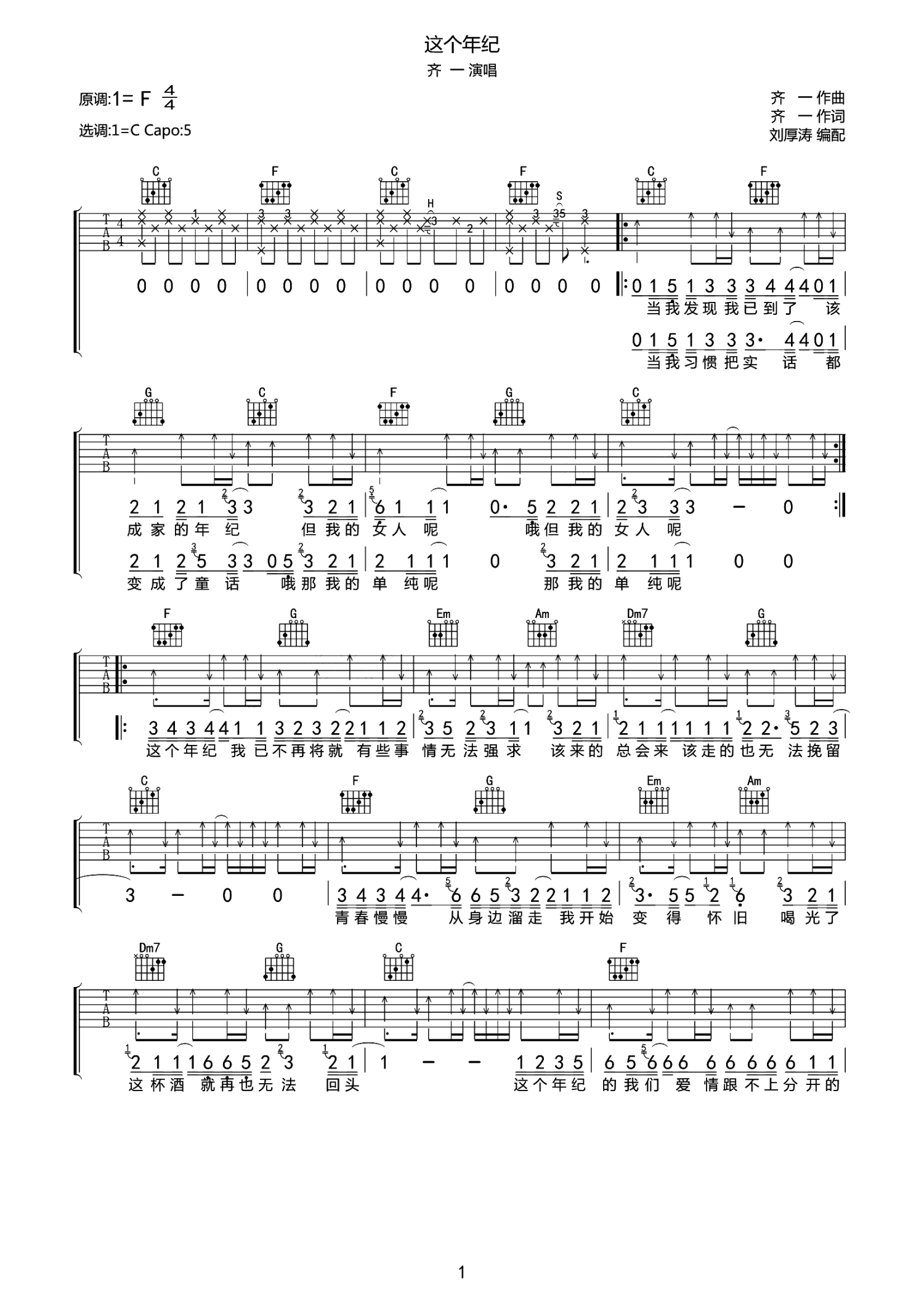 曲谱介绍: 齐一《这个年纪》吉他谱_C调吉他弹唱谱
