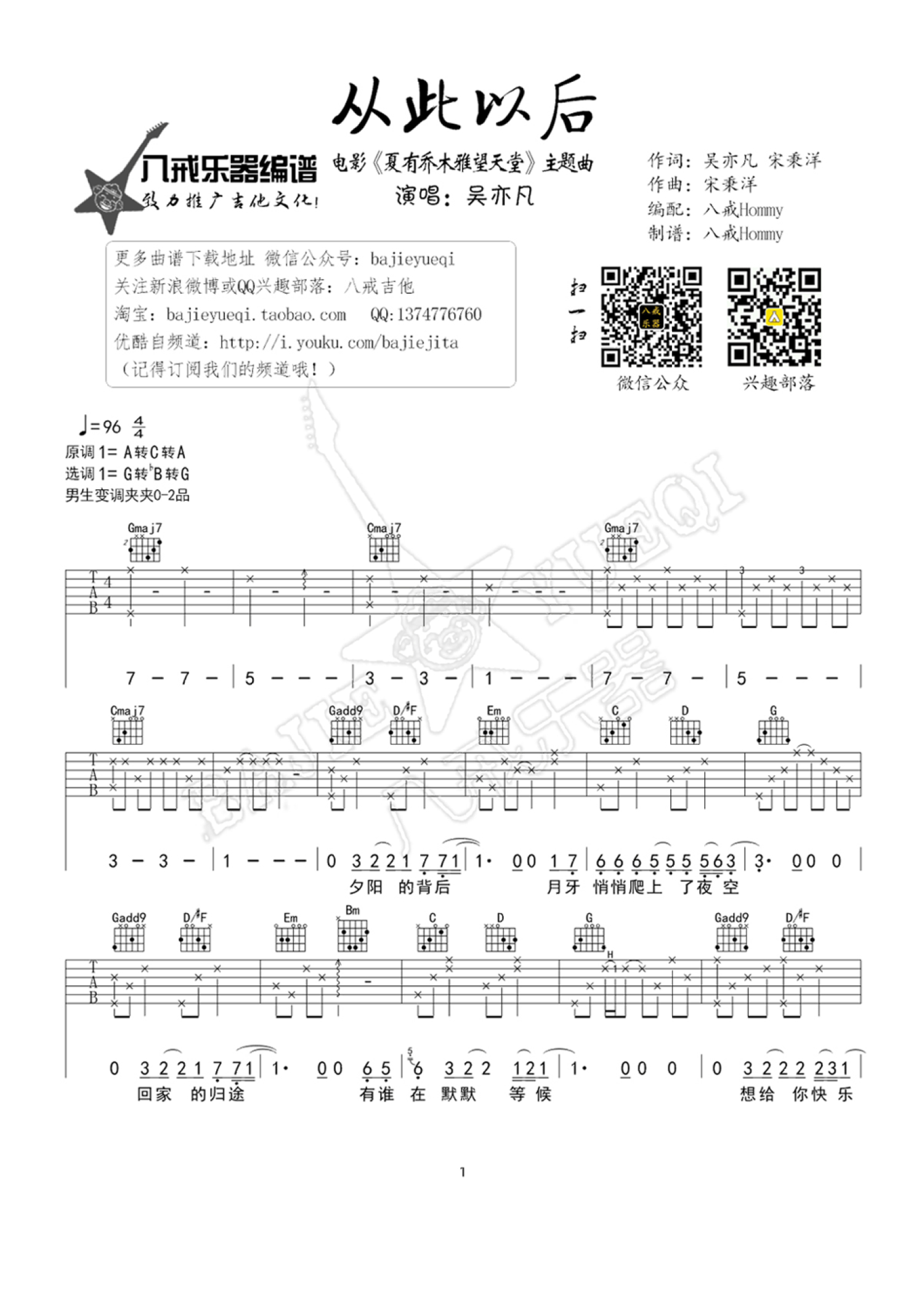 曲谱介绍: 从此以后吉他谱,吴亦凡演唱,这首歌曲是电影《夏有乔木雅望天堂》主题曲,抒情温暖的曲风,动人心弦的旋律,唱出浪漫心碎的一段爱情。
