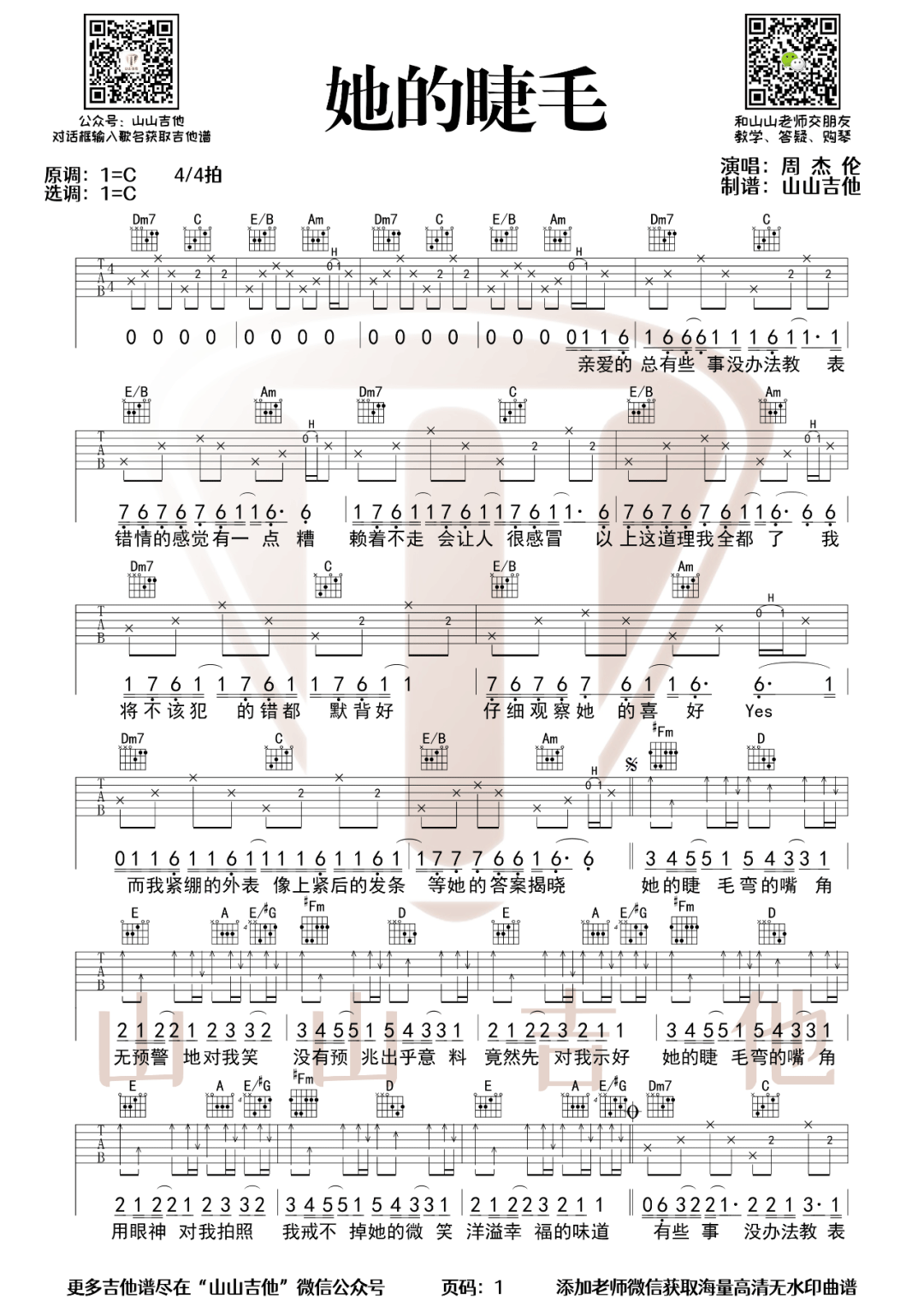 她的睫毛吉他谱 - 周杰伦 - C调吉他弹唱谱 - 原版