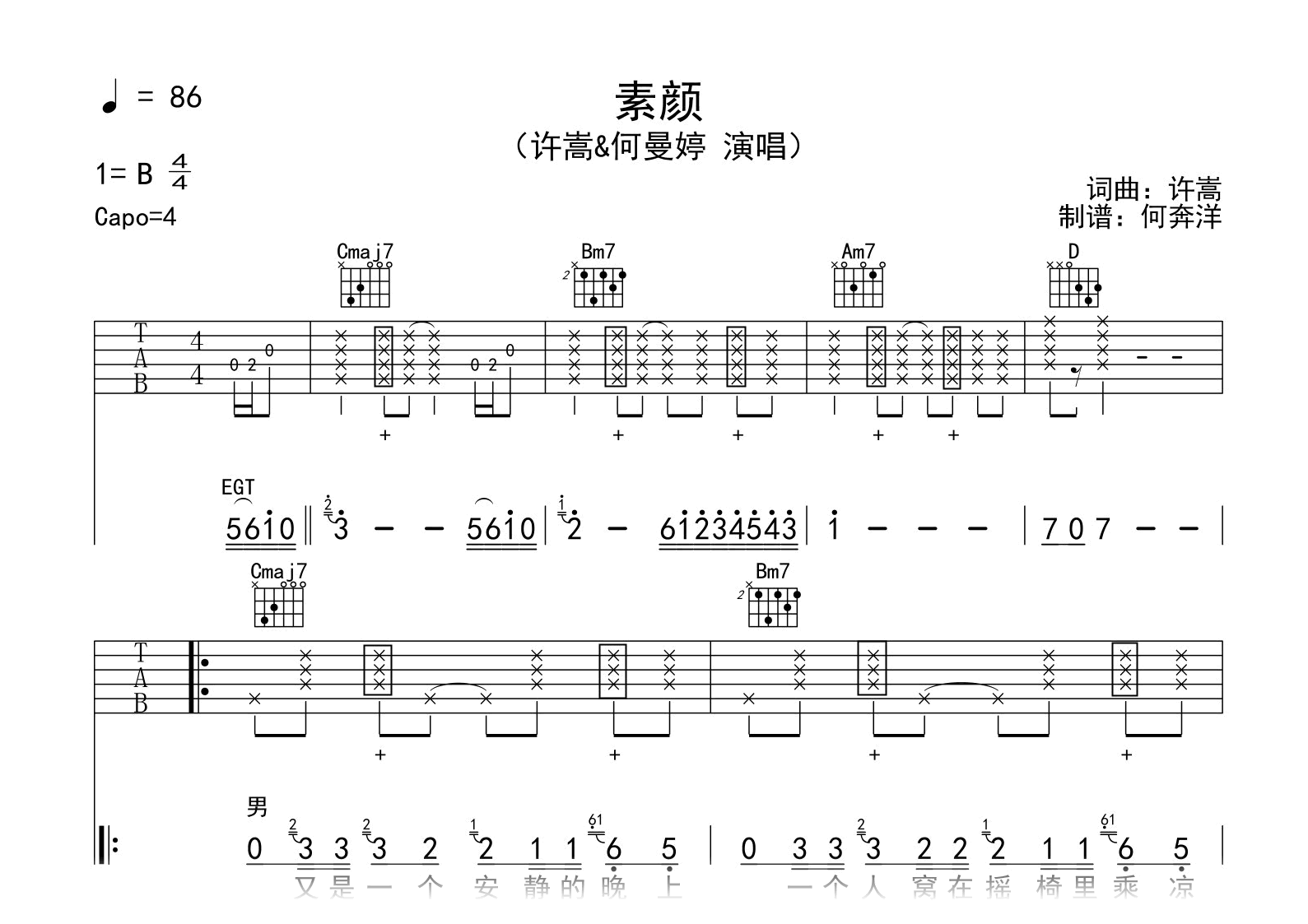 曲谱介绍: 素颜吉他谱,许嵩/何曼婷的一首经典男女对唱情歌,《素颜》吉他弹唱谱,原调B,选用G调和弦编配,变调夹capo夹四品,高清完整版共四张图片六线谱。 这首歌以男性视角展示了素面朝天无比纯洁的女生的喜欢。音乐响起,我们依然年少。那些青涩时光的回忆,都能在一首歌里听到。