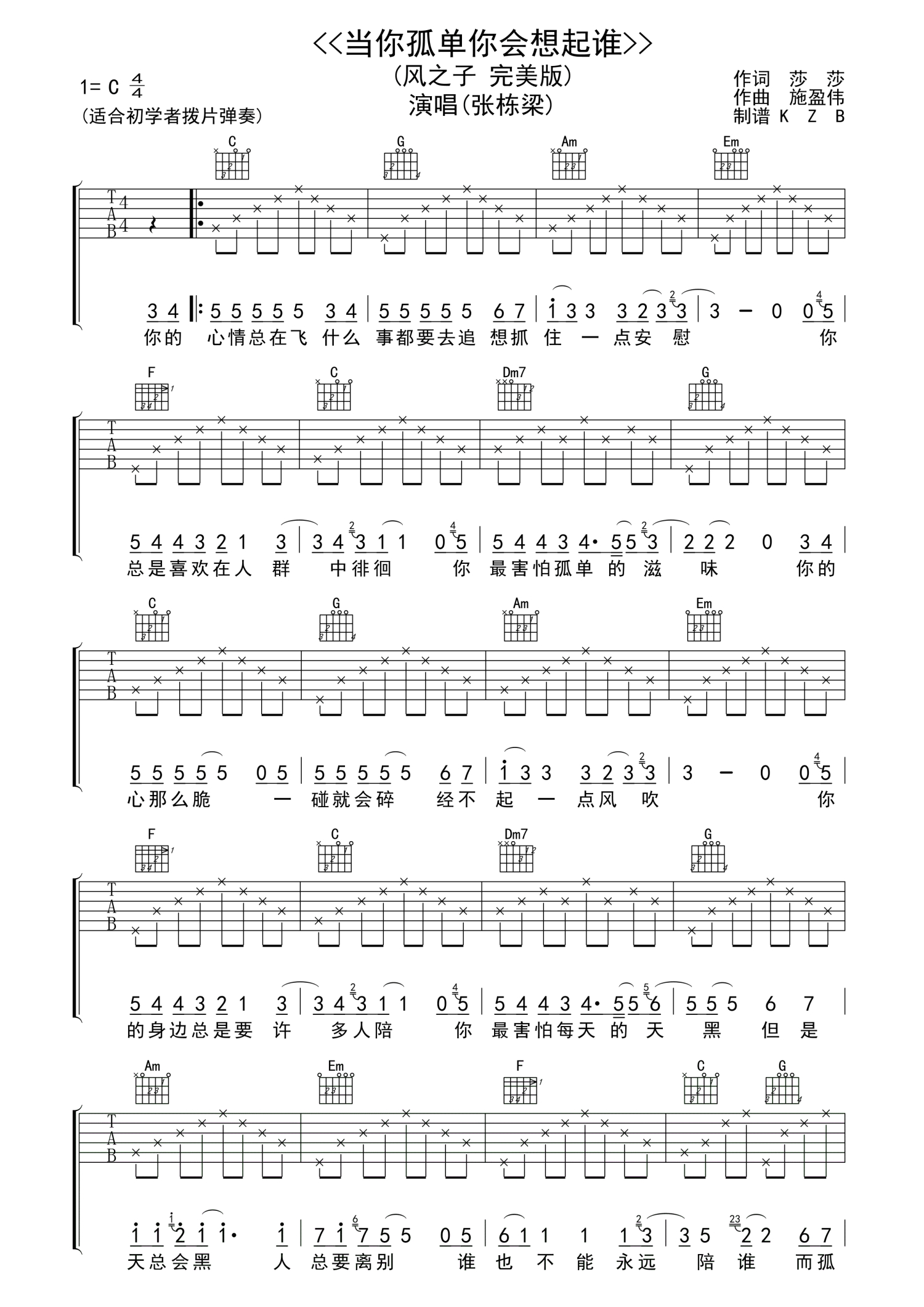 当你孤单你会想起谁吉他谱 - 张栋梁 - C调吉他弹唱谱 - 完美版