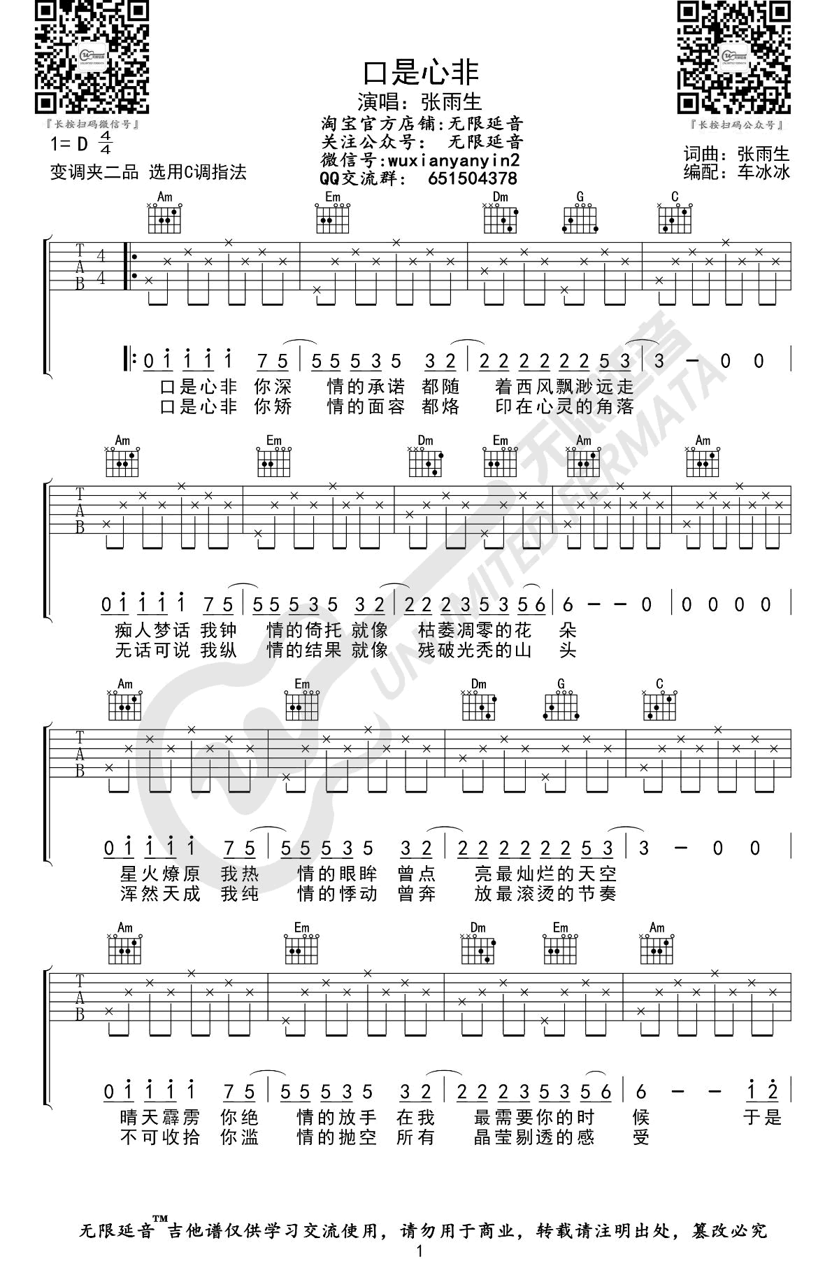 曲谱介绍: 张雨生《口是心非》吉他弹唱谱,共有2张高清图谱,免翻页排版设计。