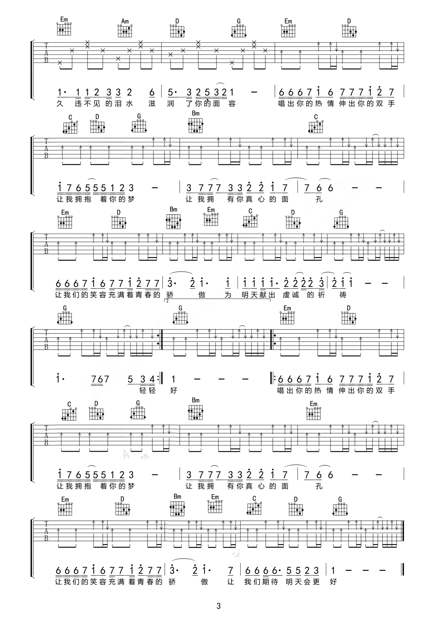 曲谱介绍: 群星《明天会更好》吉他弹唱谱,共有3张高清图谱。