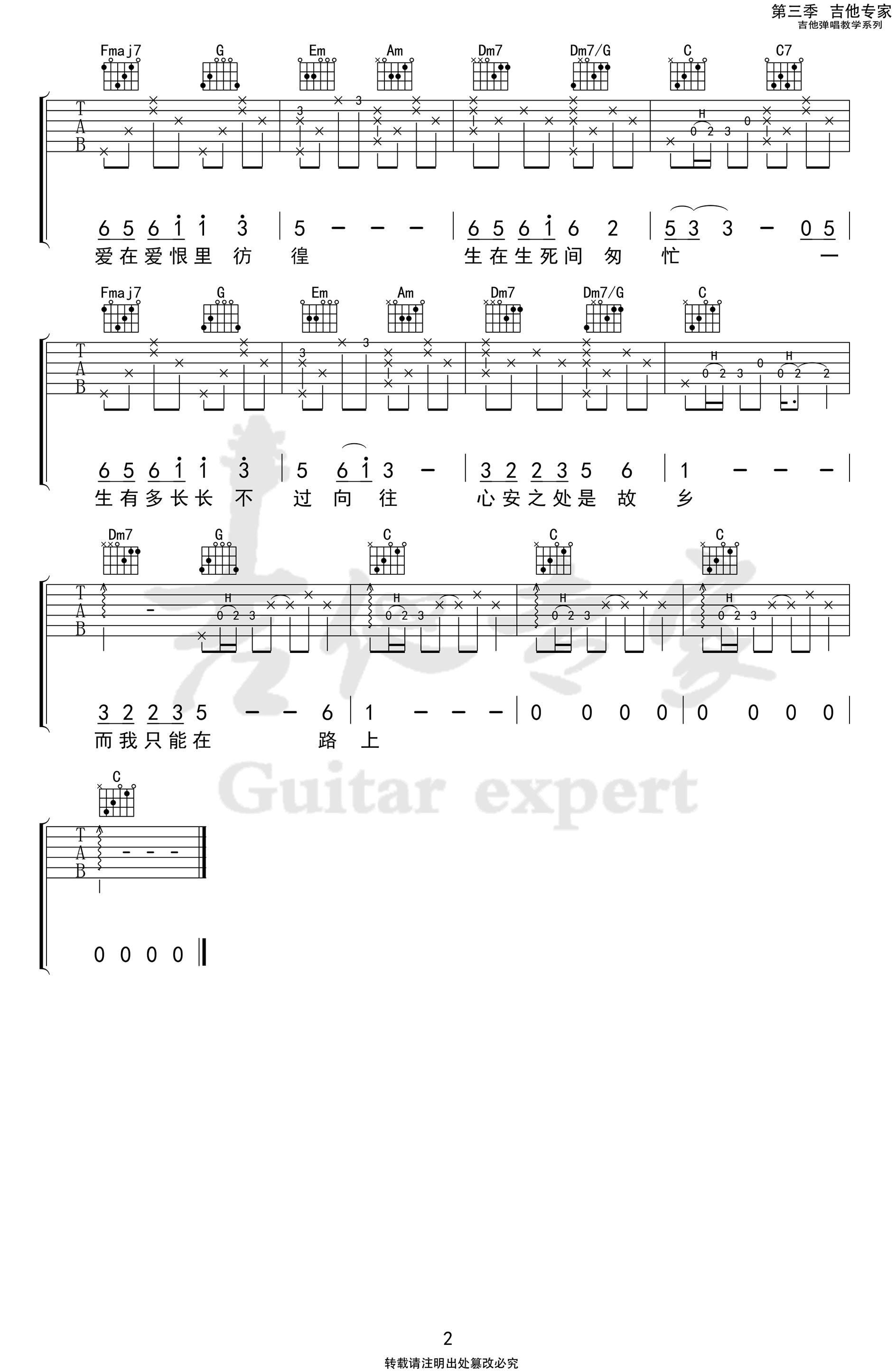 曲谱介绍: 秦霄贤《心安之处》吉他弹唱谱,共有2张高清图谱,免翻页排版设计。